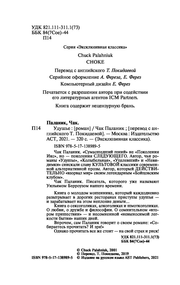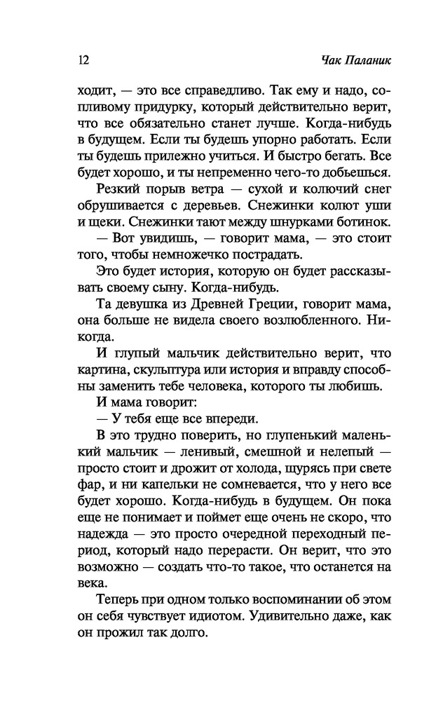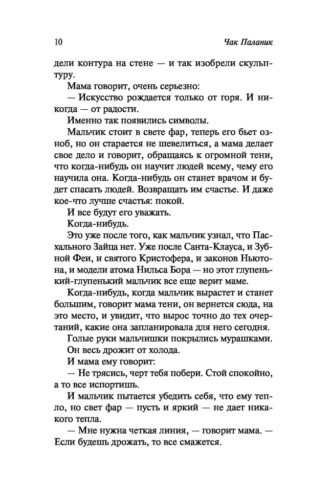 Автор на любителя! Ханжам точно не советую. Местами хочется помыться после чтения. Паланик -это про все грязное, что таится в душе и помыслах человека. Но через грязь Паланик вытягивает некий тайный смысл.
