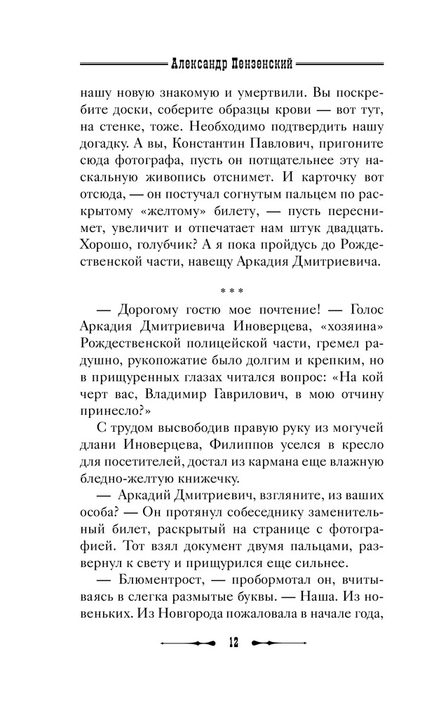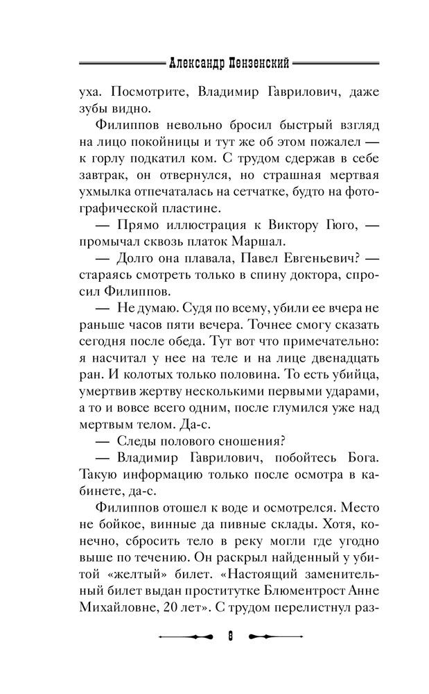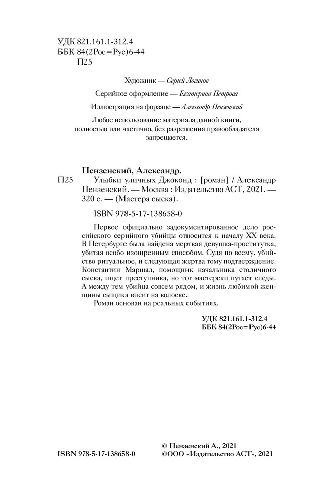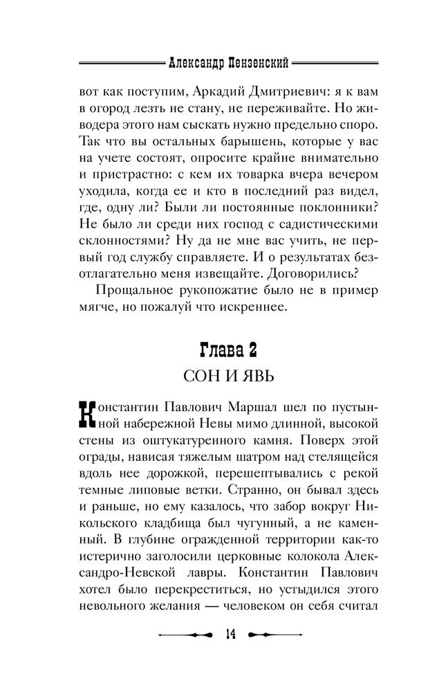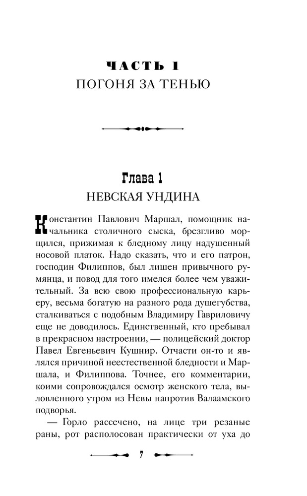 Серия: Мастера сыска Первое официально задокументированное дело российского серийного убийцы относится к началу XX века. В Петербурге была найдена мертвая девушка-проститутка, убитая особо изощренным способом. Судя по всему, убийство ритуальное, и следующая жертва тому подтверждение. Константин Маршал, помощник начальника столичного сыска, ищет преступника, но тот мастерски путает следы. А между тем убийца совсем рядом, и жизнь любимой женщины сыщика висит на волоске. Роман основан на реальных событиях. |