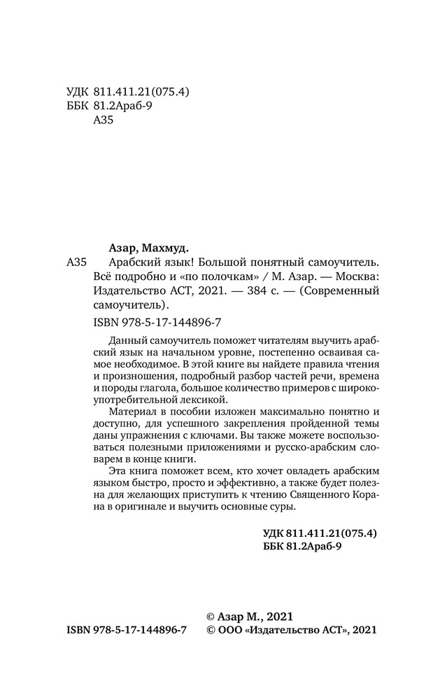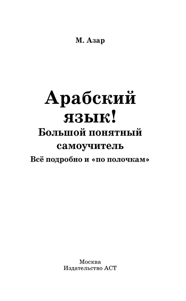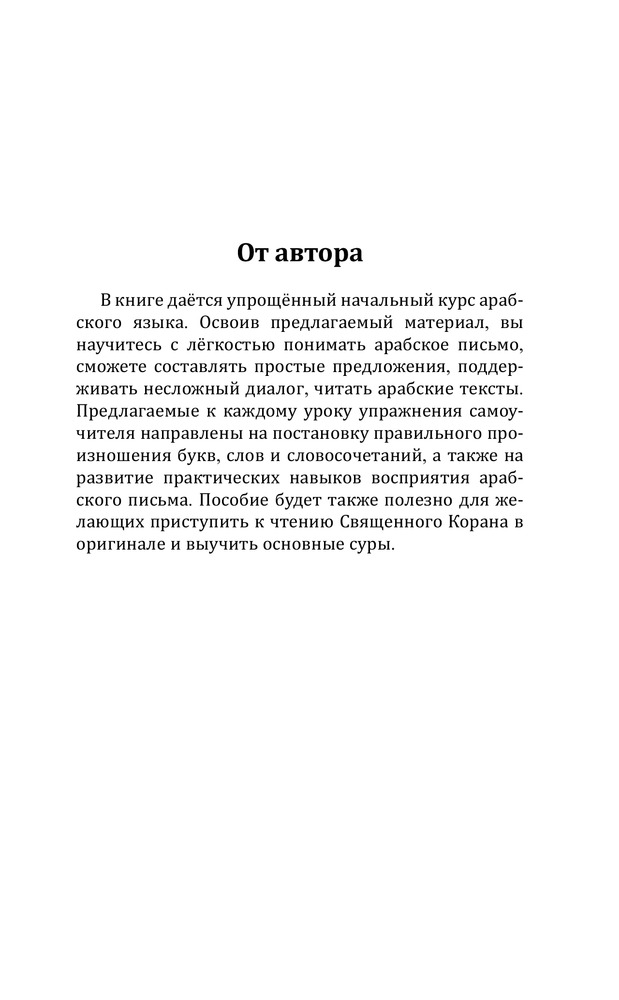 Арабский язык! Большой понятный самоучитель. Всё подробно и «по полочкам»В данный момент этот товар отсутствует в продаже. Возможно, у нас найдется аналогичный или похожий товар здесь. Серия: Современный самоучитель Данный самоучитель поможет читателям выучить арабский язык на начальном уровне, постепенно осваивая самое необходимое. В этой книге вы найдете правила чтения и произношения, подробный разбор частей речи, времена и породы глагола, большое количество примеров с широкоупотребительной лексикой. Материал в пособии изложен максимально понятно и доступно, для успешного закрепления пройденной темы даны упражнения с ключами. Вы также можете воспользоваться полезными приложениями и русско-арабским словарем в конце книги. Эта книга поможет всем, кто хочет овладеть арабским языком быстро, просто и эффективно, а также будет полезна для желающих приступить к чтению Священного Корана в оригинале и выучить основные суры. |