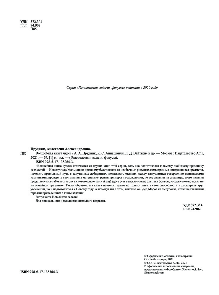 💳 Оплатить за товар можно при получении 🇰🇿 Есть бесплатная доставка по Казахстану от 1 дня 🎁 Копите бонусы с каждой покупки Серия: Головоломки, задачи, фокусы «Волшебная книга чудес» отличается от других книг этой серии, ведь она подготовлена к самому любимому празднику всех детей — Новому году. Малыши по-прежнему будут искать на необычных рисунках самые разные потерявшиеся предметы, находить правильный путь в запутанных лабиринтах, показывать отличия между кажущимися совершенно одинаковыми картинками, проверять свои знания в математике, решая примеры и головоломки, но все задания на страницах этого издания представлены в забавных играх на новогоднюю тему. А ещё здесь есть увлекательные опыты и фокусы, которые можно показать на семейном празднике. Таким образом, эта книга позволит детям не только развить свои способности и расширить круг увлечений, но и подготовиться к Новому году. А помогут им в этом, конечно же, Дед Мороз и Снегурочка, ставшие главными героями приведённых в книге упражнений. Встречайте Новый год весело! |