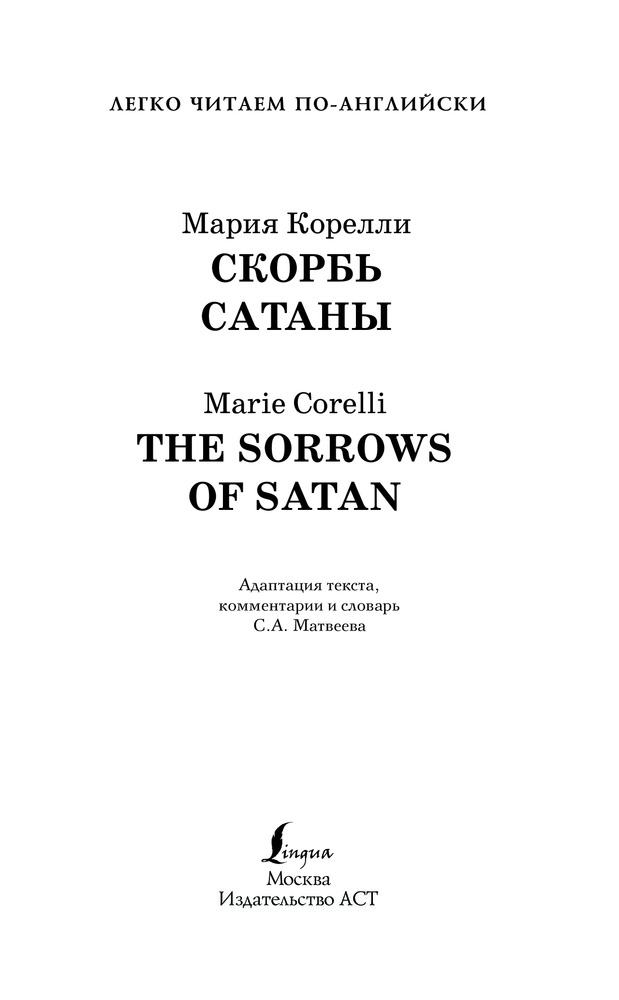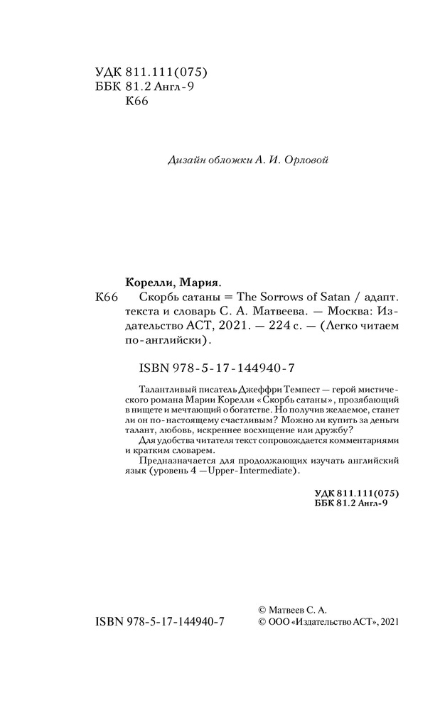 💳 Оплатить за товар можно при получении 🇰🇿 Есть бесплатная доставка по Казахстану от 1 дня 🎁 Копите бонусы с каждой покупки Серия: Легко читаем по-английски Талантливый писатель Джеффри Темпест — герой мистического романа Марии Корелли «Скорбь сатаны», прозябающий в нищете и мечтающий о богатстве. Но получив желаемое, станет ли он по-настоящему счастливым? Можно ли купить за деньги талант, любовь, искреннее восхищение или дружбу? Для удобства читателя текст сопровождается комментариями и кратким словарем. Предназначается для продолжающих изучать английский язык (уровень 4 — Upper-Intermediate). |