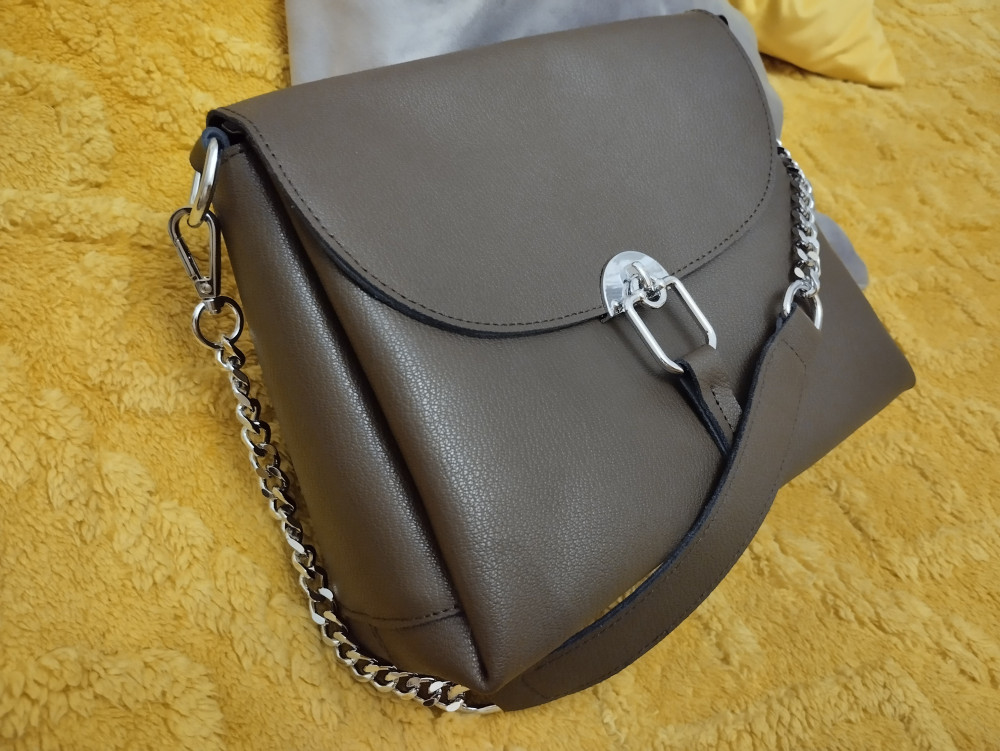 Цена отличная. На этикетке написано кожа натуральная. Сшито аккуратно, карманов много внутри, фурнитура на вид качественная, серебристого цвета. Пряжка на магните. В наличии два ремня: один длинный, регулируемый для носки кросс-боди, изнутри тканевый. Второй ремешок с цепочкой- на плечо, цепь тяжелая и плотного плетения, ремень кожаный с двух сторон.