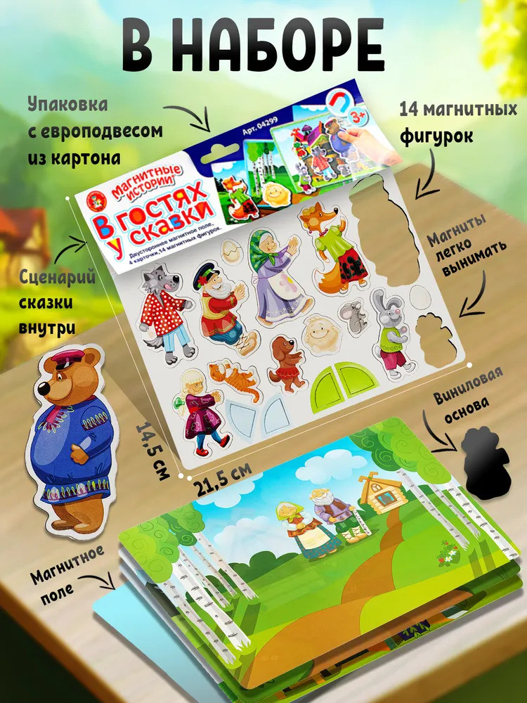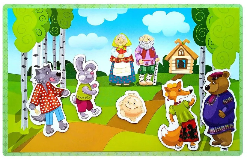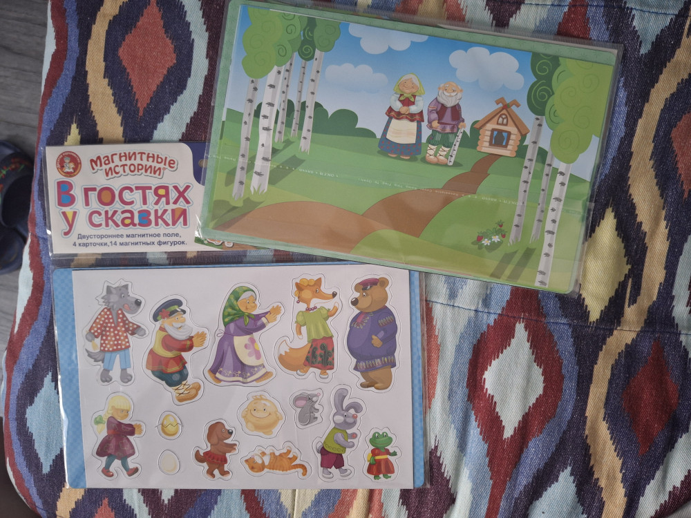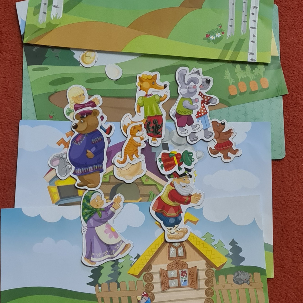 Хороший набор. Здесь есть персонажи 4 сказок - Теремок, Колобок, Репка, Курочка ряба. Вложена магнитная подложка и листы с картинками к этими сказкам, чтобы их накладывать на магнитную подложку, как декорацию.