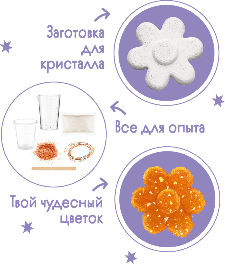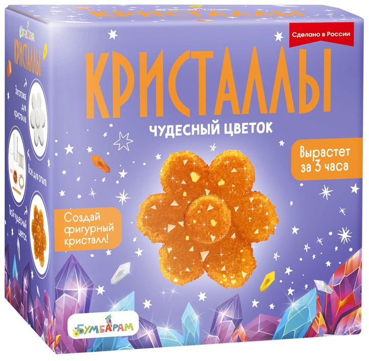 Выращивание кристаллов — это отличная возможность не только понаблюдать за чудесами окружающего мира, но и сотворить их самому! С набором «Кристаллы:Чудесный цветок» вы сможете изготовить сияющий фигурный кристалл в форме оранжевого цветка. Кристальная фигурка станет как отличным украшением для комнаты, так и необычным подарком. В заготовке есть специальное отверстие, поэтому готовым кристаллом можно будет украсить комнату или повесить его на елку.