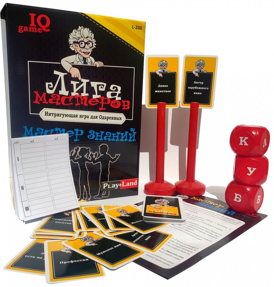 «Лига мастеров. Мастер знаний» — это интригующая настольная игра на эрудицию и воображение для детей старше 12 лет. Игра развивает память, скорость реакции и концентрацию. Игра проходит в несколько раундов. Задача игроков — быстро вспомнить и записать как можно больше слов, которые должны соответствовать определенным условиям. А именно: слово должно начинаться с буквы, которая выпала на кубике. Слово должно подходить под категорию, которая указана на карте. В игре представлены самые разные категории на любой вкус. Побеждает тот игрок, кто по итогам всех раундов записал больше всех слов и набрал больше всего баллов. |