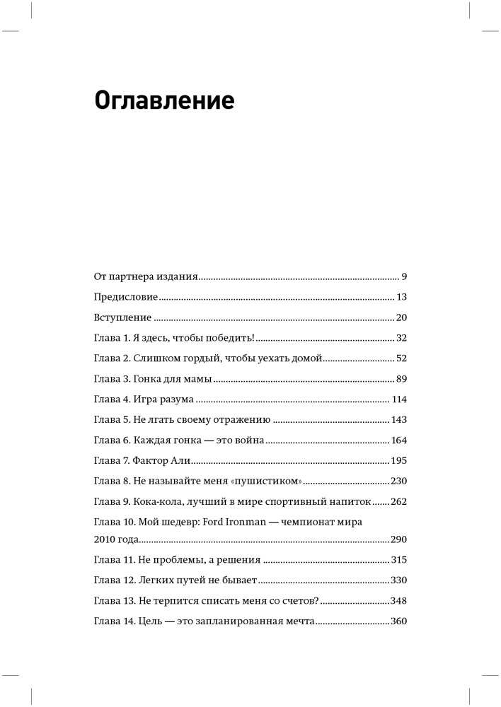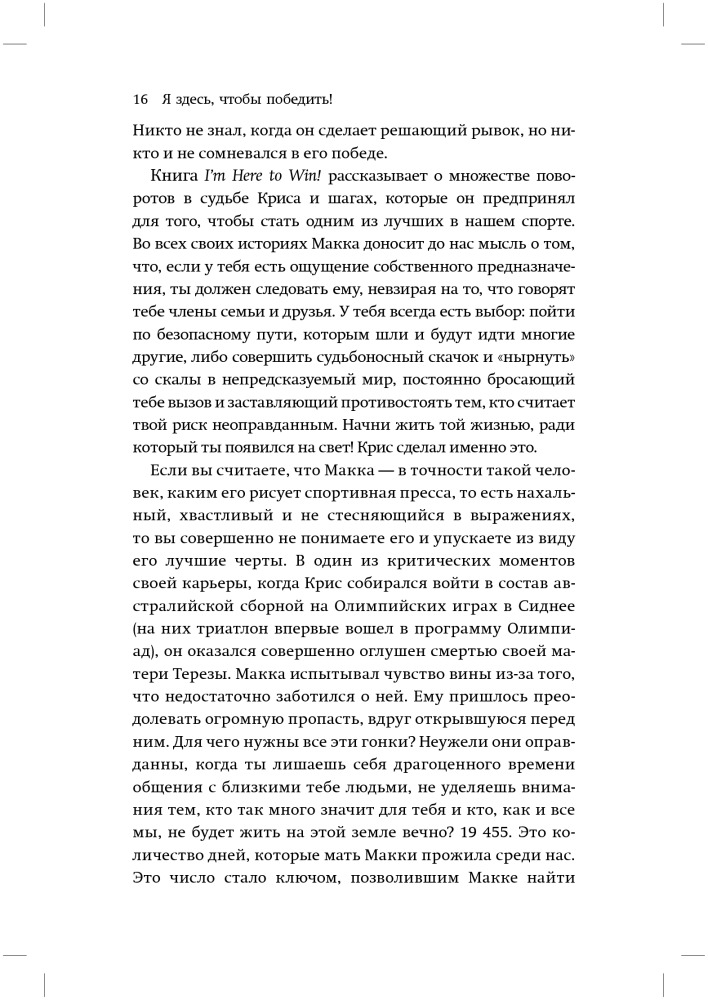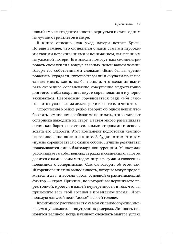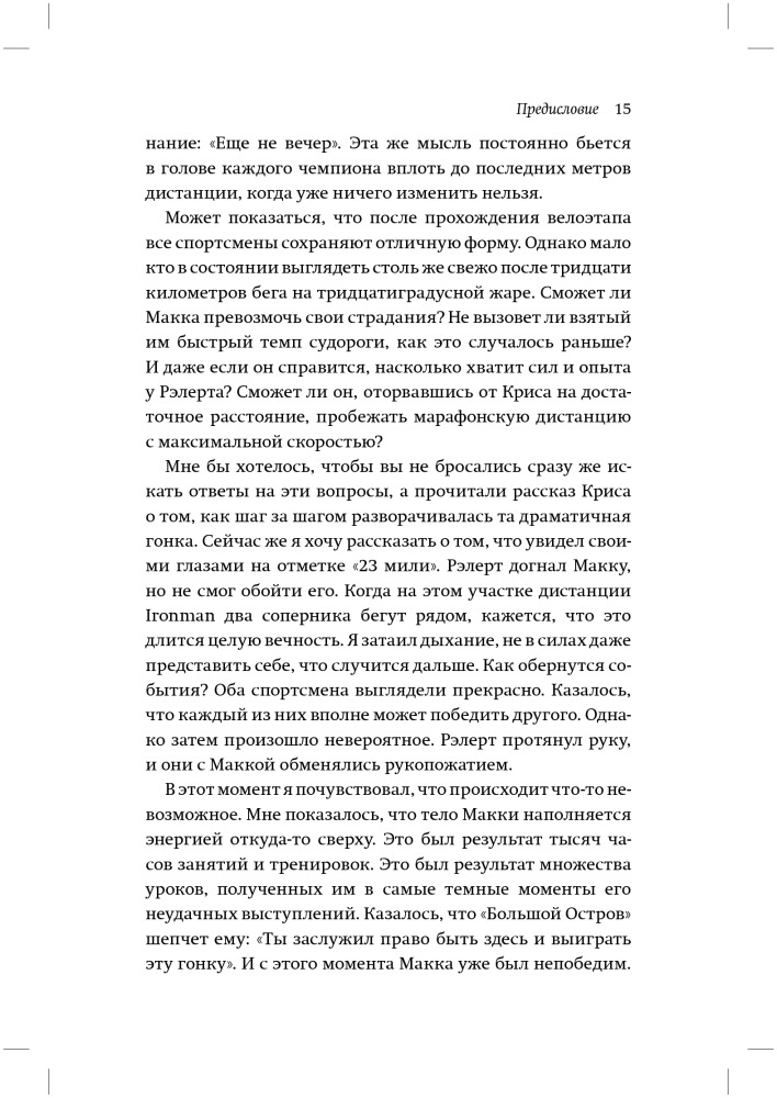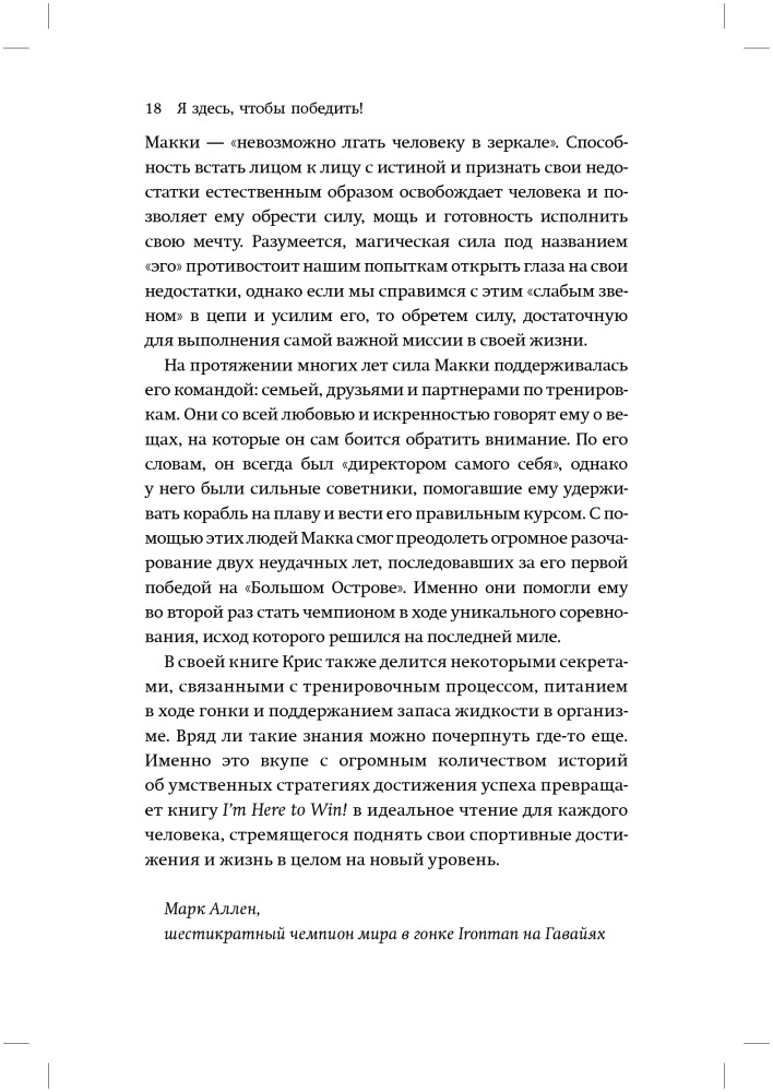 Тем не менее, я считаю, что меня часто понимают неправильно. Поэтому хочу прямо и недвусмысленно, здесь и сейчас рассказать о том, кто я такой, что и как я делаю. Моя карьера связана не только с физическим талантом или упорными тренировками. От других триатлетов меня отличает масса факторов: участие в подспудной психологической войне с другими спортсменами, откровенный взгляд на свои недостатки и систематический поиск путей их преодоления, попытки решения своих проблем за пределами спортивных площадок. Совместите вместе все эти факторы, и получите самую блестящую карьеру во всей истории спорта. Вот что стоит за моим успехом.