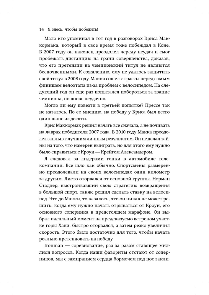 Я профессиональный спортсмен. Я не гонюсь за майкой победителя и не стремлюсь услышать, как комментатор Майк Рейли громогласно объявляет: «You are an Ironman!» («Ты — Железный Человек!») в тот момент, когда преодолеваю финишную черту. Моя задача проста — я должен выиграть гонку. Этим я зарабатываю себе на жизнь. Поэтому, действуя в рамках правил и принятых традиций, буду делать все, что в моих силах, для достижения преимущества. И если это выводит из себя некоторых молодых непрофессионалов, что ж... извините.