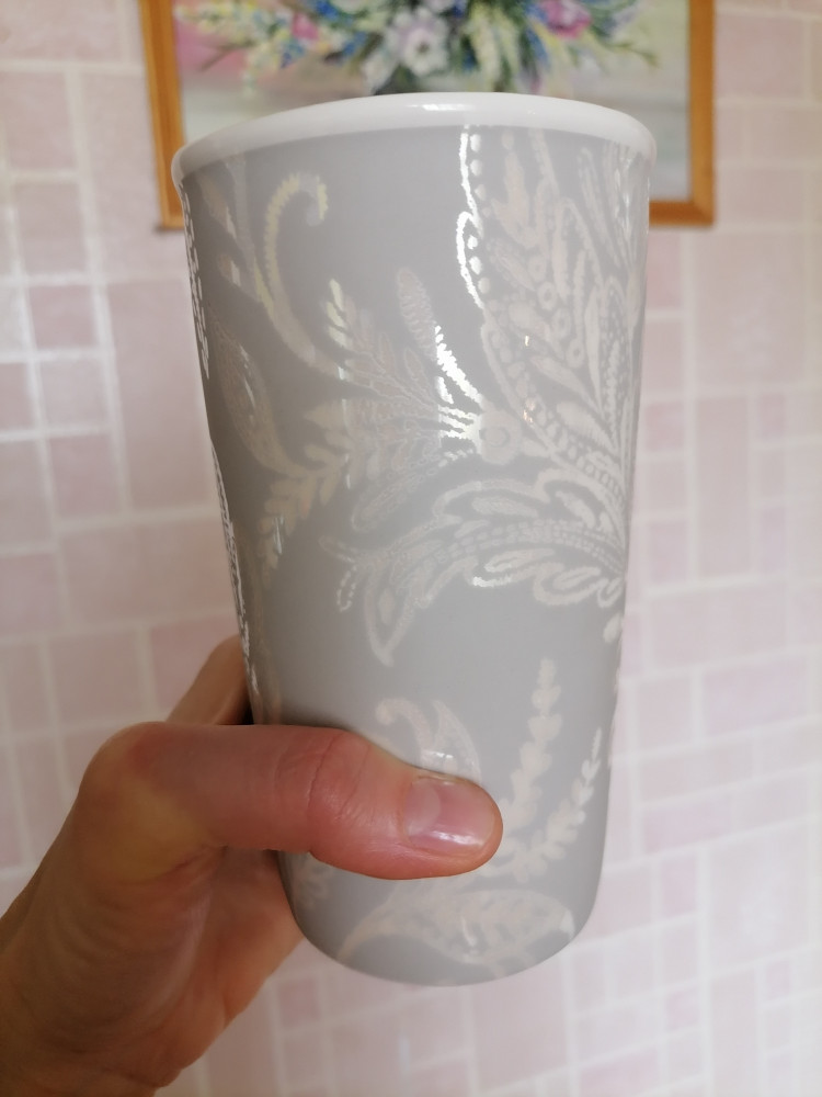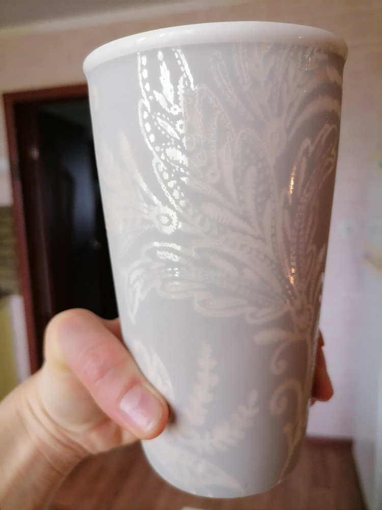 Очень красивая кружка, фото не передаёт. Основа светлая перламутрово-зеркально-глянцевая, а основа Серая матовая, это очень красиво! Т. Е Светлый рисунок это перломутровый глянцевый узор. Неожиданно большая и тяжёлая! Я очень довольна!