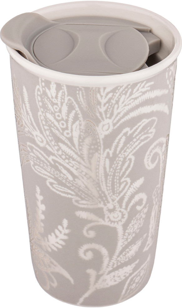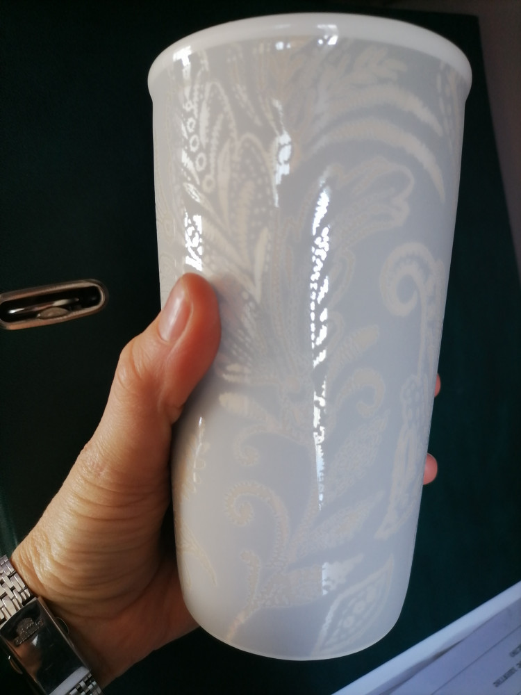 Очаровательный высокий стакан для кофе из фарфора,а не кружка ! Красивый рисунок в виде кружева нанесён матовым покрытием на глянцевую поверхность.