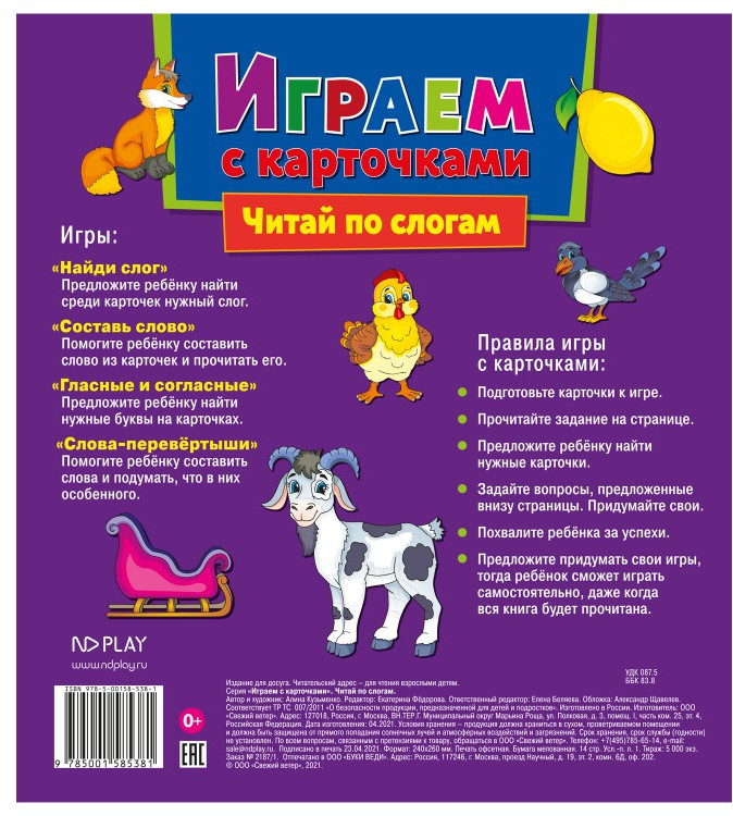 💳 Оплатить за товар можно при получении 🇰🇿 Есть бесплатная доставка по Казахстану от 1 дня 🎁 Копите бонусы с каждой покупки В развивающей книге «Играем с карточками. Читай по слогам» собраны полезные и увлекательные задания для малышей. Детская книга поможет малышу развить навыки чтения и понимания текста с помощью различных заданий с карточками. |