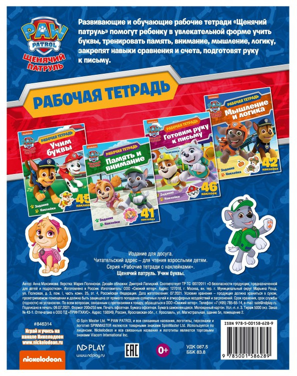 Рабочая тетрадь с наклейками. Щенячий патруль. Учим буквыВ данный момент этот товар отсутствует в продаже. Возможно, у нас найдется аналогичный или похожий товар здесь. Знаете, чем отличается буква от звука? Отважные собачки из мультфильма «Щенячий патруль» с легкостью познакомят ребенка с алфавитом и превратят обучение в увлекательную игру! |