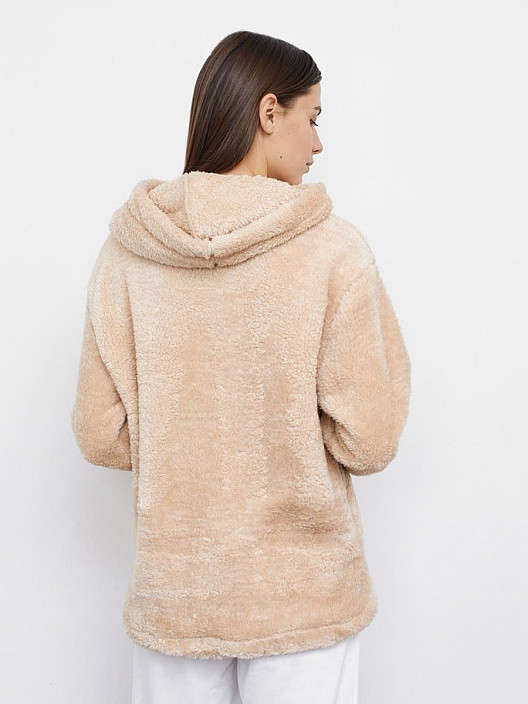 Очаровательное домашнее худи из трикотажного меха. Силуэт прямой и свободный. Горловина круглой формы с уютным капюшоном. Рукава широкие, линия плеча слегка спущена, что дарит особый комфорт. В такой одежде невозможно не расслабиться!