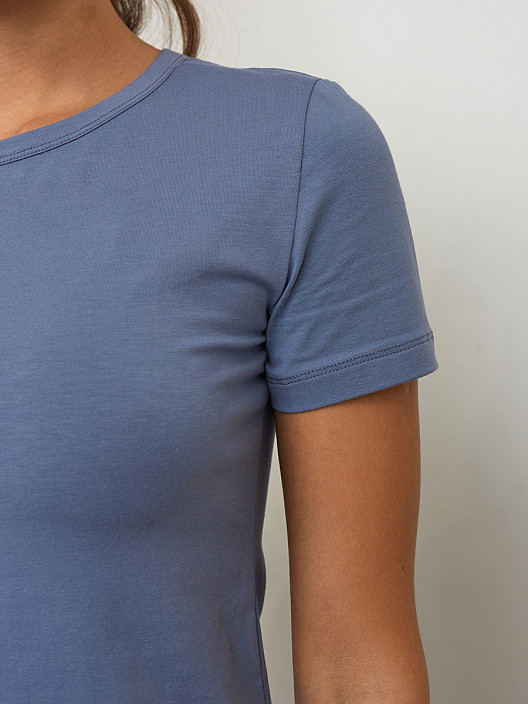 Прилегающая футболка из кулирного полотна. Горловина круглой формы. Рукава короткие. Универсальная футболка для спорта, прогулок и домашних дел.