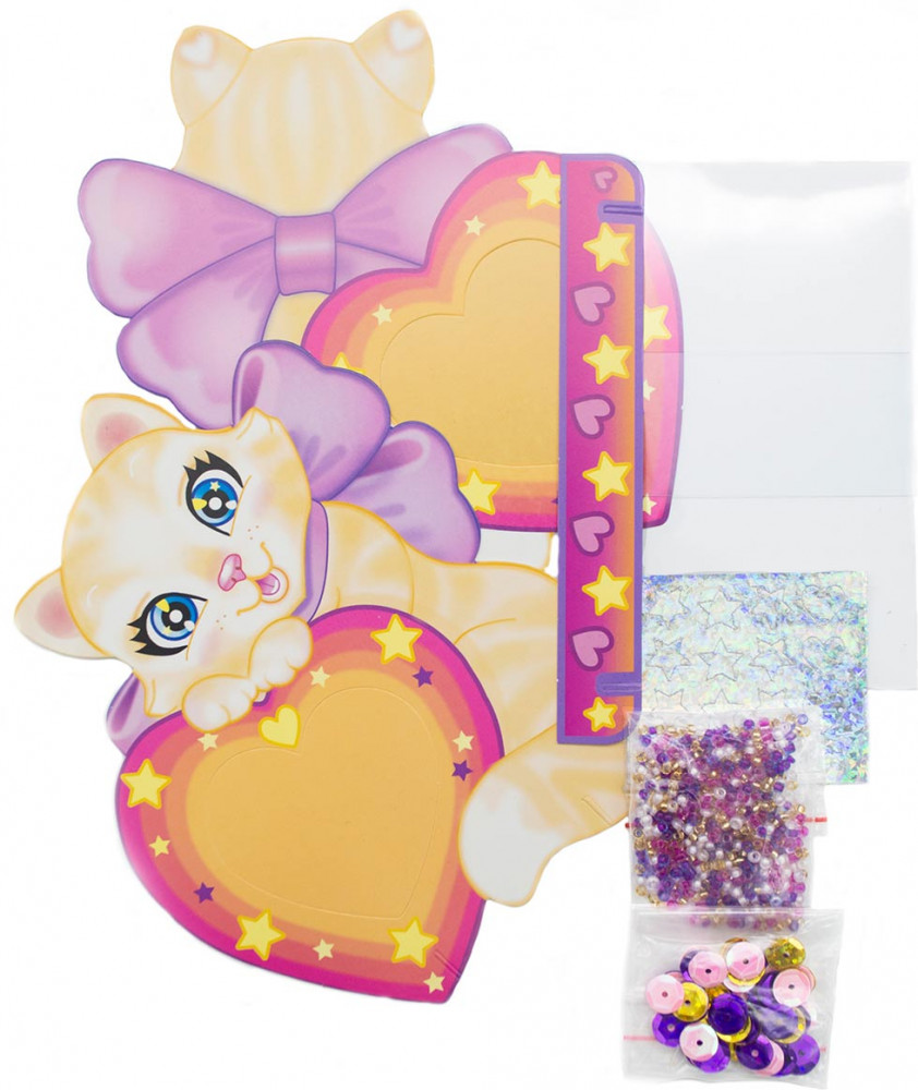 В наборе: готовые детали из картона и пластика, пайетки, бисер, бумажная лента, двусторонний скотч (объемный и тонкий).