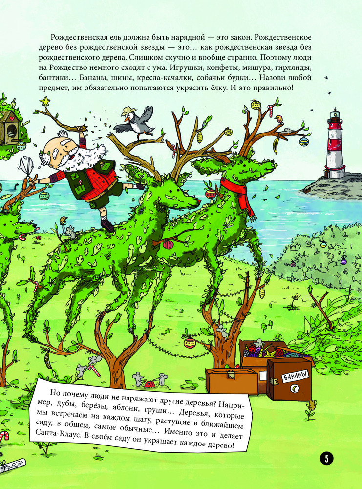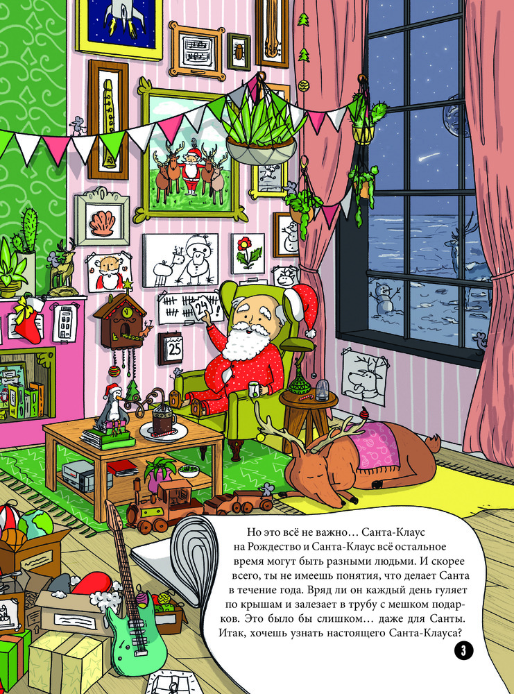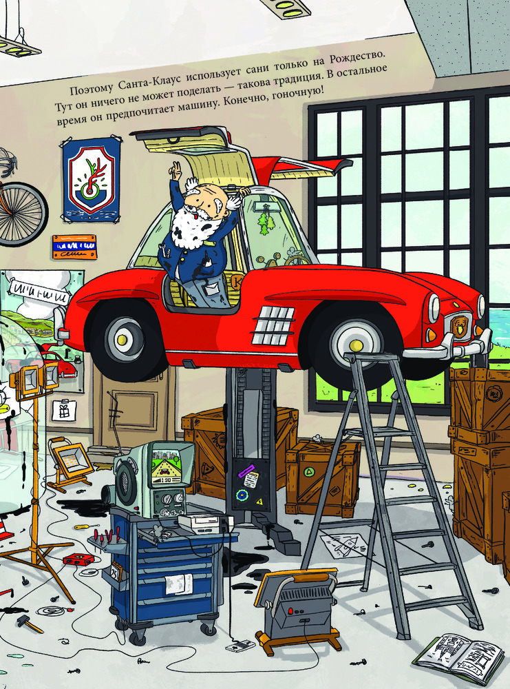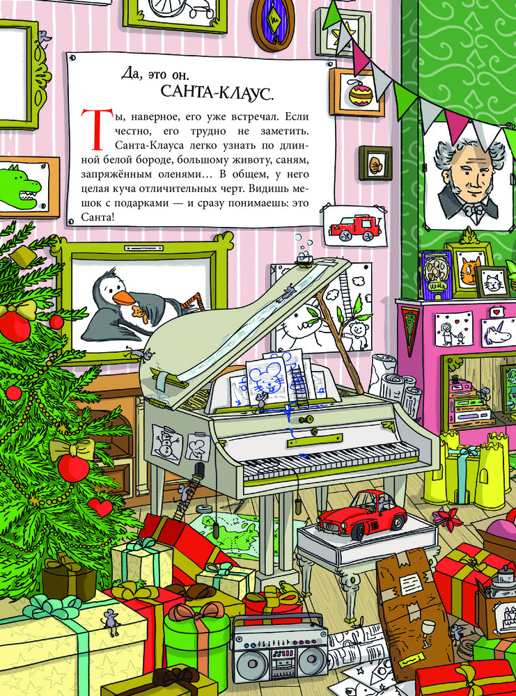 Серия: Книжки к Новому Году Красный костюм, белая борода, упряжка с оленями и огромный мешок подарков — кто это? Конечно, это Санта Клаус! Именно таким мы знаем его на Рождество. Но чем же он занимается весь остальной год? На каких «санях» катается в обычные дни? Где хранит рисунки и поделки, подаренные ему детьми? Какую зарядку делает, чтобы пролезать в дымоходы? Хочешь узнать ответы на эти и многие другие вопросы о Санте? Загляни к нему в гости. Прояви всю свою наблюдательность, изучая его дом, и Санта сумеет тебя удивить!  |