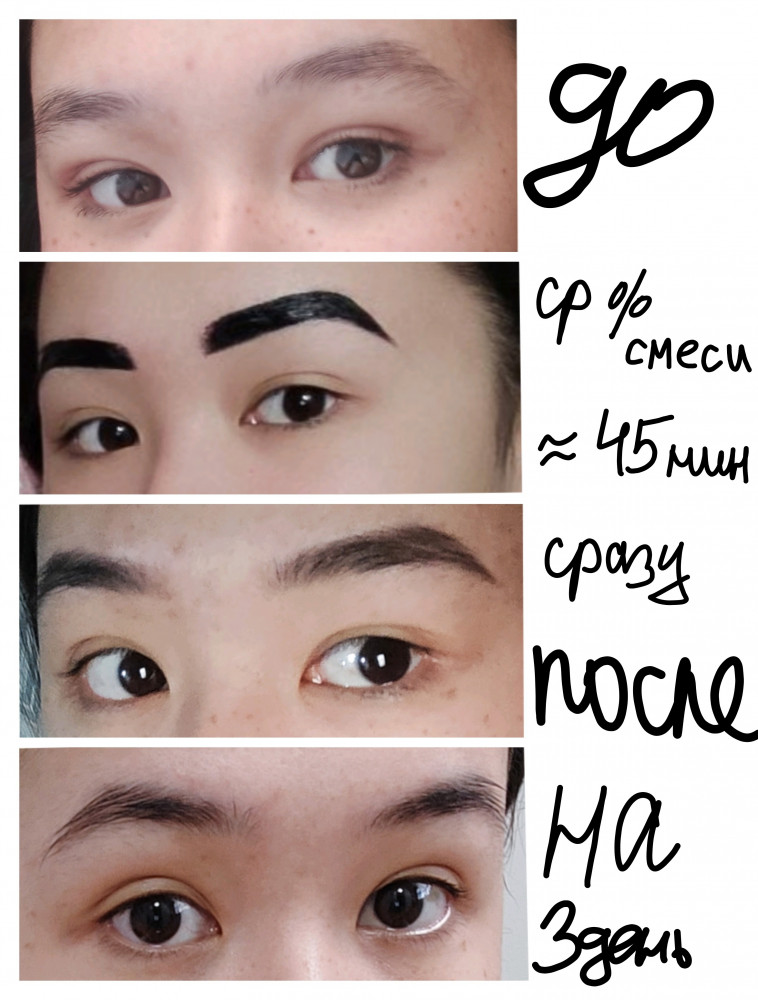хорошая краска, можно подбирать интенсивность краски и найти свою идеальную формулу. черный цвет вполне натуральный, если боитесь, то можно просто подержать совсем немного и смесь сделать менее густой. но я люблю прямо таки заметный результат, так как с каждым днём эффект сходит на нет. Очень маленький расход, в инструкции было написано наполнит пол баночки. в первый раз сделала все, как было указано: в итоге не знала куда деть потом остаток, намазюкала на ноге фигню какую то. держится на коже уже больше недели)) если тюбик не засохнет, думаю, мне его хватит ещё на несколько лет)) никакого раздражения не было, даже во время нанесения. на ноге тоже все ок. лежала чуть ли не час с бровями 🙃 с кожи краска уходит все таки быстро, но на волосках уже больше 1.5 недель держится. мне нравится эффект 👀 можете сравнить первое и послд фото в коллаже. волосков больше не стало конечно, но они выглядят толще и темнее, брови выразительнее. ничем не укладывала и не подкрашивали брови на всех фото. рекомендую 🙃