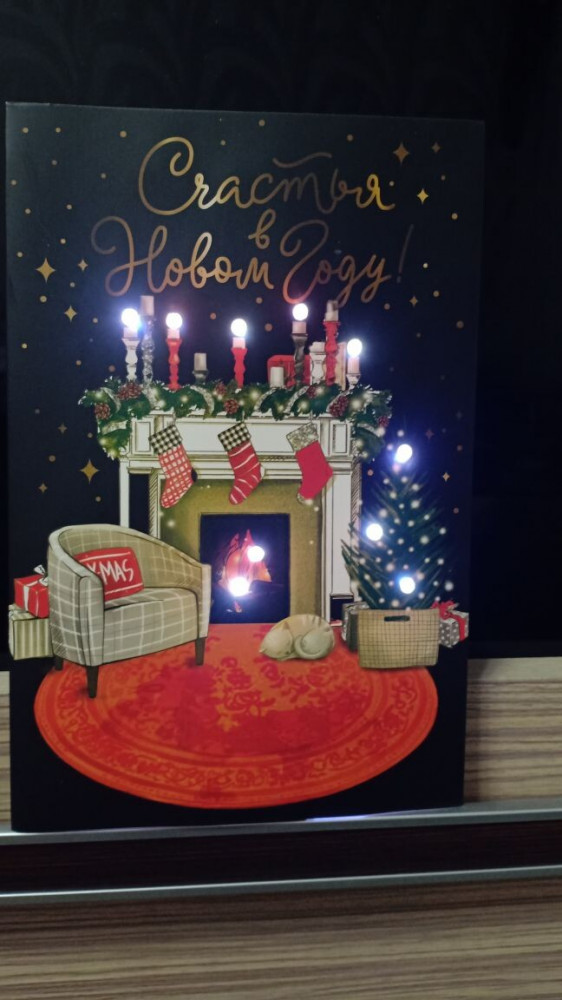 Очень понравилась открытка. Светодиодная гирлянда - ее фишка, при включении загораются свечи на камине, подсвечивается огонь и елочка. Классный новогодний сувенир к подарку! И очередной раз хочется поблагодарить Flip за быструю доставку даже такой мелочи, как открытка)))