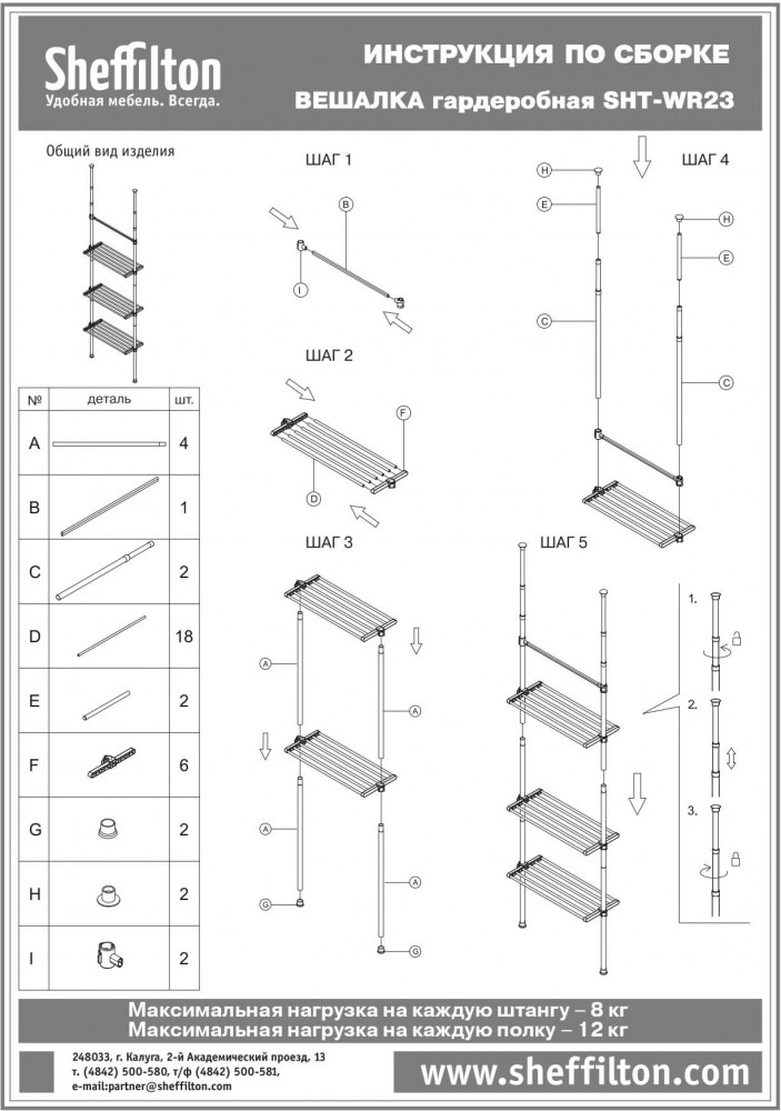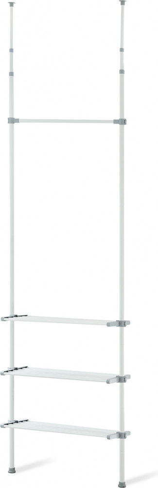 Система крепится между полом и потолком враспор. Основные вертикальные штанги телескопически регулируются по высоте от 240 до 280 см. Данная функция очень удобна при установке в нишу или комнату с индивидуальными размерами. Возможен монтаж углом.