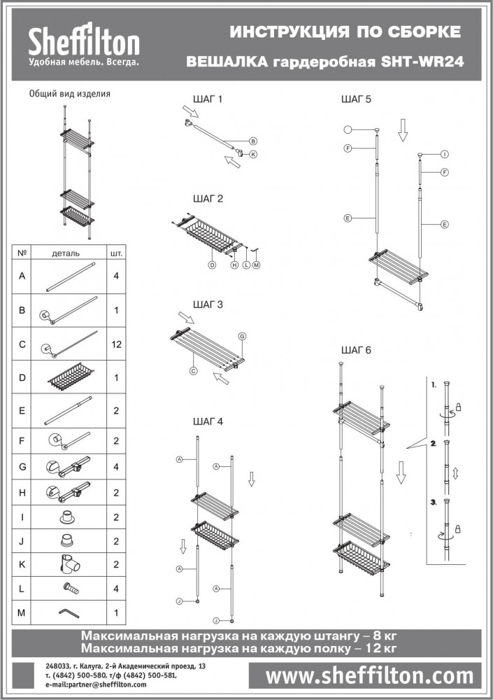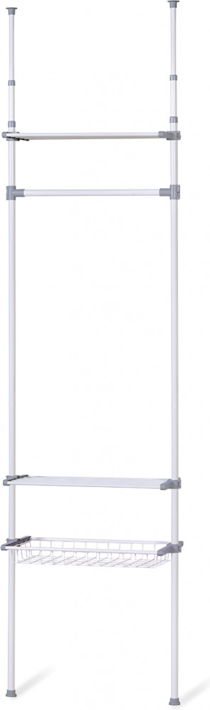 Система крепится между полом и потолком враспор. Основные вертикальные штанги телескопически регулируются по высоте от 240 до 280 см. Данная функция очень удобна при установке в нишу или комнату с индивидуальными размерами. Возможен монтаж углом.