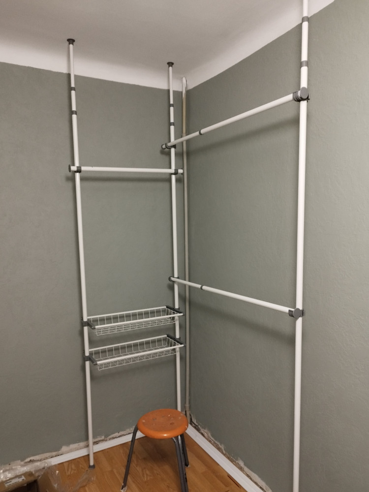Система крепится между полом и потолком враспор. Основные вертикальные штанги телескопически регулируются по высоте от 240 до 280 см. Данная функция очень удобна при установке в нишу или комнату с индивидуальными размерами. Возможен монтаж углом.