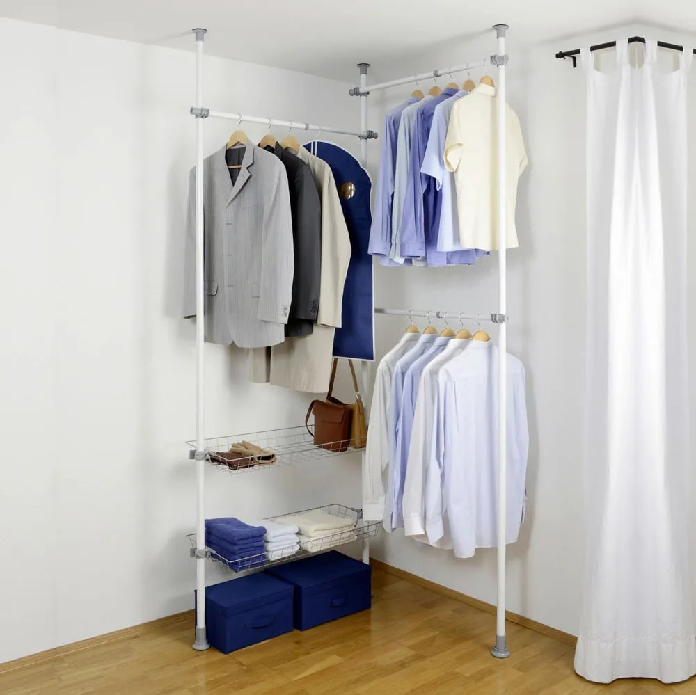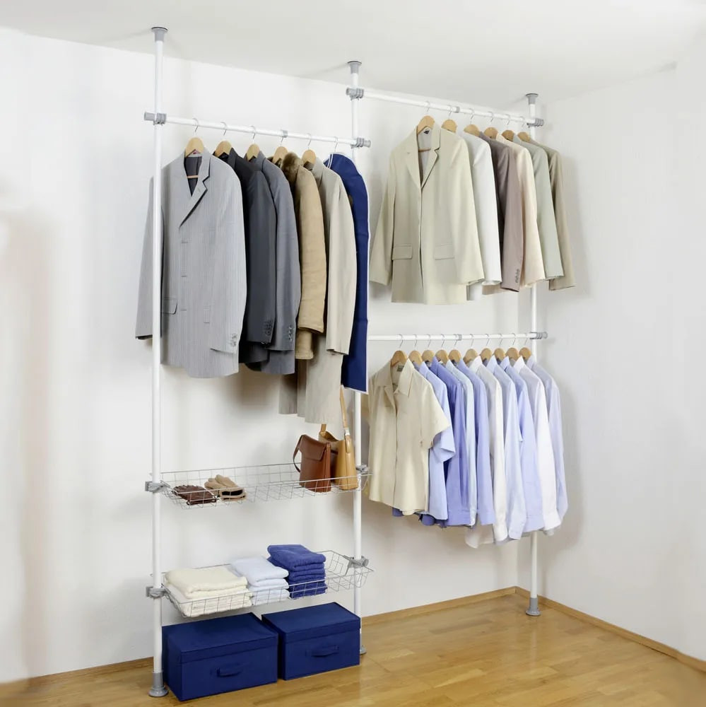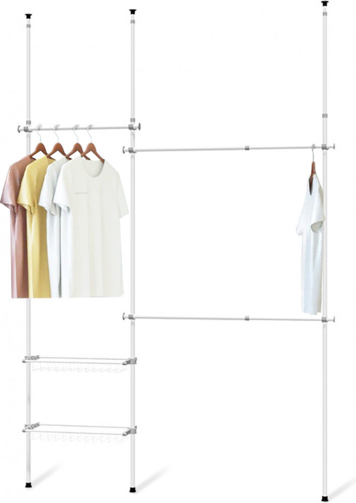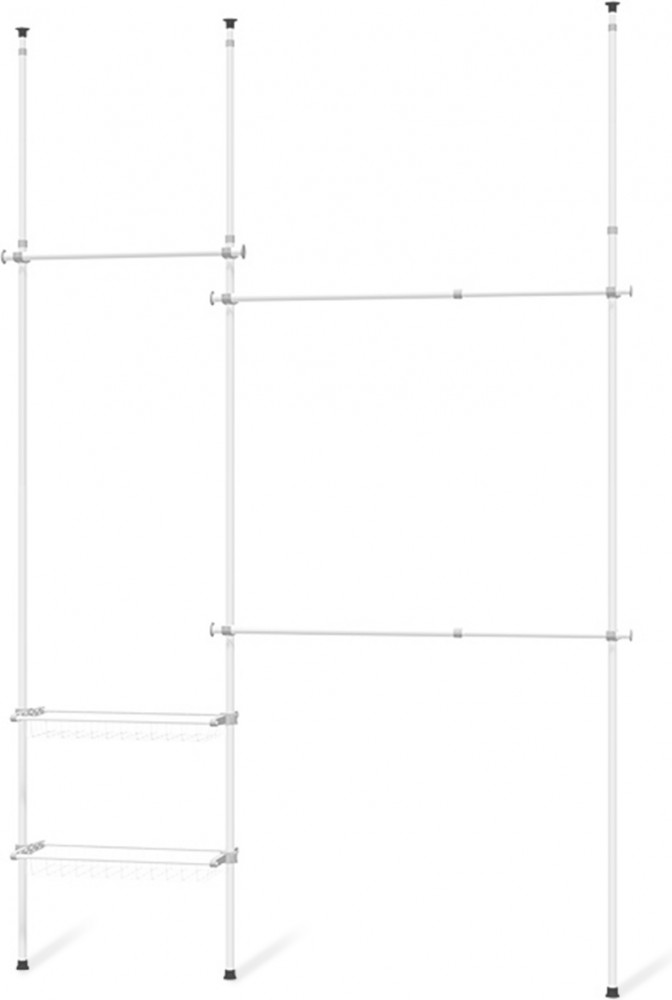 Мечта для любой гардеробной! Эта система предлагает достаточно места для платьев, пальто, пиджаков, брюк и рубашек. Две регулируемые по высоте корзинки (размер каждой 80 на 27 см.). Три регулируемые по высоте штанги для подвешивания 80 и 121 см.