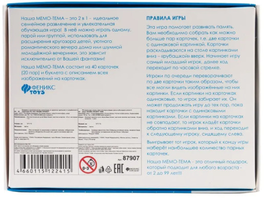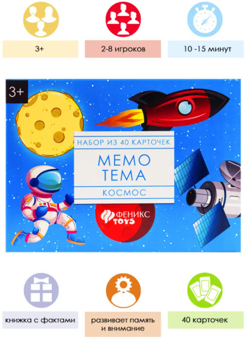 💳 Оплатить за товар можно при получении 🇰🇿 Есть бесплатная доставка по Казахстану от 1 дня 🎁 Копите бонусы с каждой покупки «Мемо-тема» — это развивающая настольная игра для детей. Тема игры — всё о космосе. Целью игры является «открытие» как можно большего числа парных карточек. Игра ведется двумя одинаковыми колодами карточек, на лицевой стороне которых изображены картинки. Игра помогает развить познавательные процессы, память, реакцию, способность аргументировать свой выбор. |