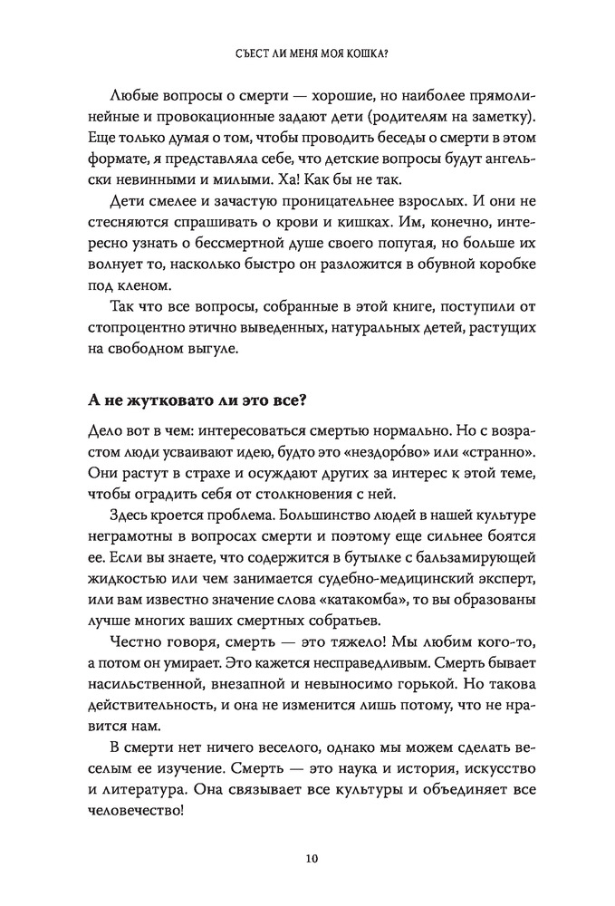 Съест ли меня моя кошка? И другие животрепещущие вопросы о смертиВ данный момент этот товар отсутствует в продаже. Возможно, у нас найдется аналогичный или похожий товар здесь. Серия: Страшно интересно Автор бестселлеров и похоронных дел мастер Кейтлин Даути отвечает на реальные вопросы детей о смерти, мертвых телах и разложении. Книга — бестселлер New York Times, победитель премии Goodreads Choice Award 2019 в категории «Наука и Технологии». |