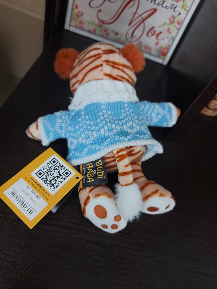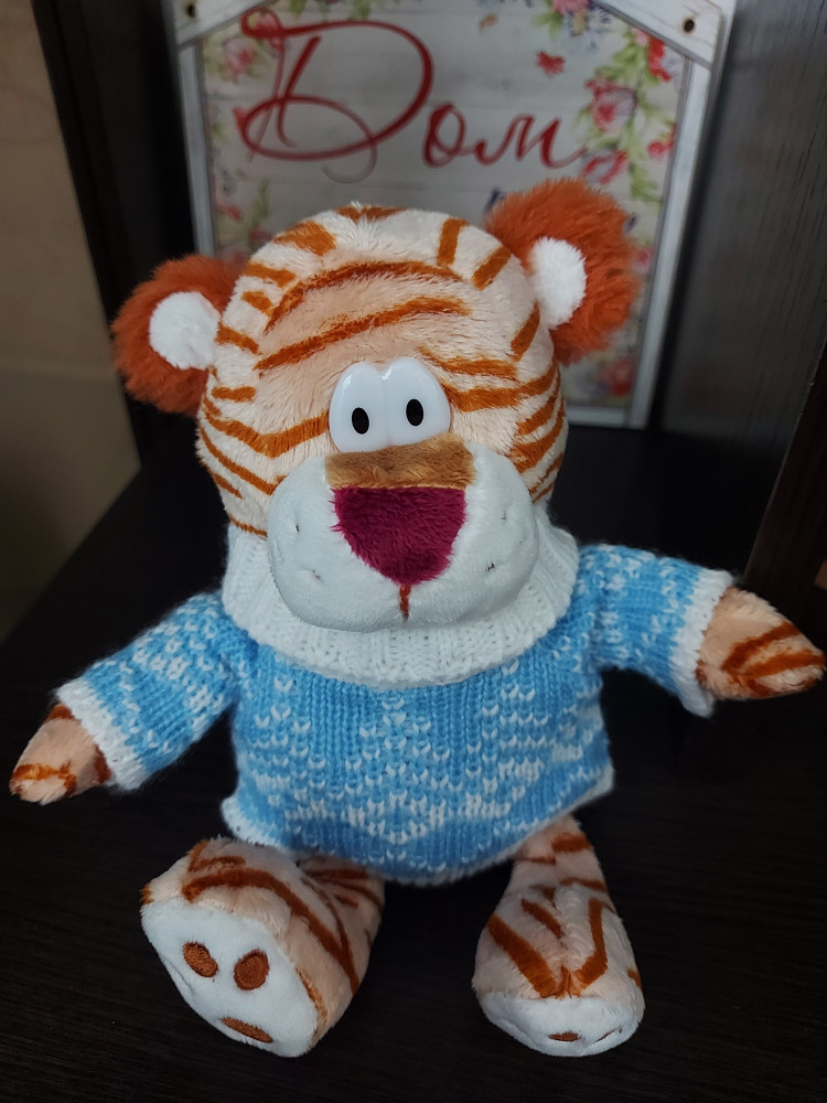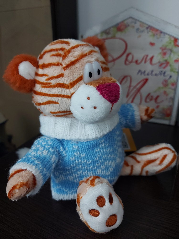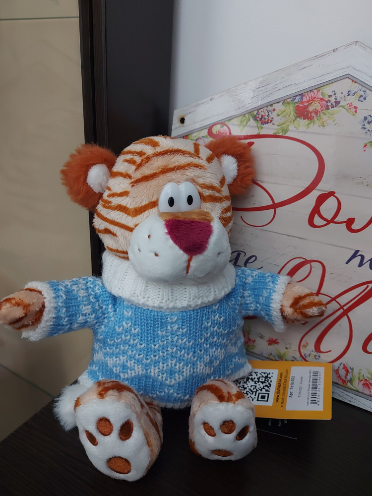 Милый тигрёнок, на ощупь нежный. Расцветка кофты не соответствует. Должна быть белой, а рисунок голубой. А у нас всё наоборот. Может цвет кофты зависит от партии.