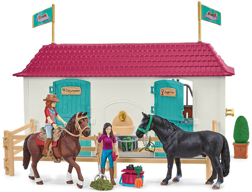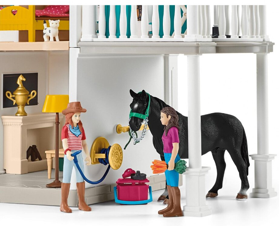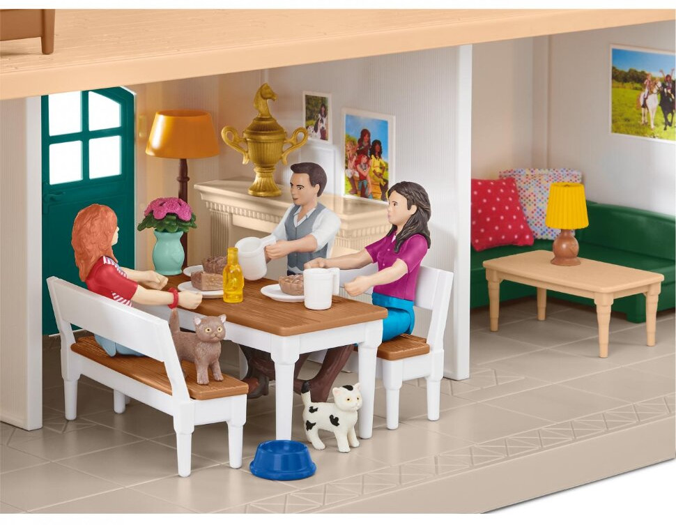Загородный дом и конюшня является домом для Ханны и ее родителей и предлагает широкий выбор игровых функций и аксессуаров. На кухне они могут съесть яблочный пирог прямо из духовки на кухонном столе или украдкой перекусить из холодильника. Тарелку, чашки, кастрюлю и сковороды моют в раковине. Как и ее родители Оливер и Кэролайн, фигурка Ханны полностью подвижна и может сидеть, кататься и стоять. Все они заботятся о жеребце Quarter-horse Кайенне и ганноверском жеребце Юпитере. Лошадей готовят к тренировкам с помощью хорошей стрижки с использованием карт и гребешка для карри, а затем их обуздывают и оседлают с помощью седла и уздечки. Пока ее родители проводят вечер на балконе или на диване у стола в гостиной, Ханна крадется на чердак по лестнице на двухъярусную кровать. Там она играет с котятами и находит золотой ключик. Все они надевают пижамы в ванной, прежде чем выключится свет на тумбочке. Каждый укладывается в постель на подушку и укрывается одеялом и мечтает о новых приключениях верхом на лошади.