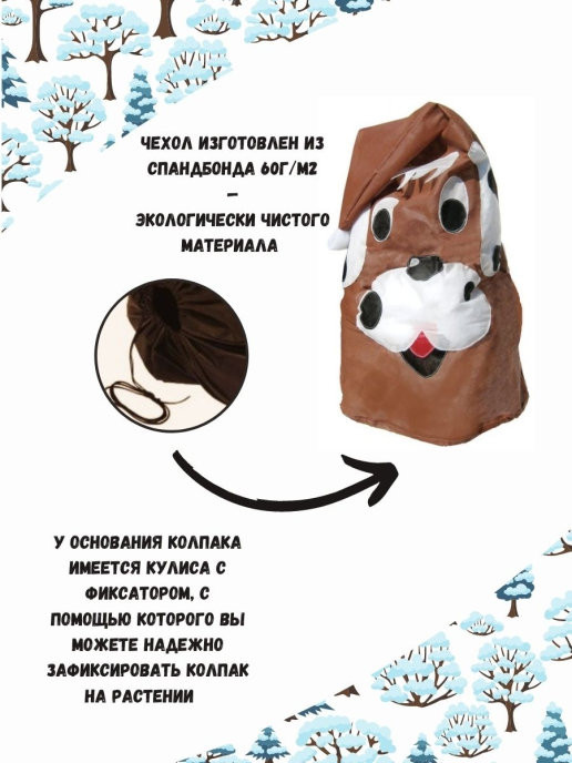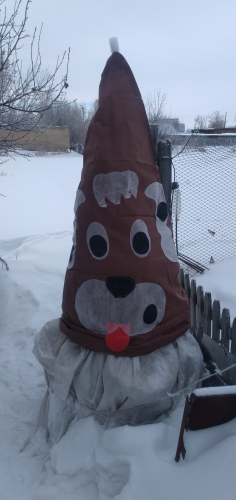 "Собачка" мне понравилась. Прошита хорошо. Укрыла мою пихточку, а то каждую зиму макушка подмерзала. Только по высоте чуть не подошла, деревце повыше оказалось. Но это не проблема,главное что верхушка закрыта, а снизу укрывным обмотала. И КРАСИВО. 👍