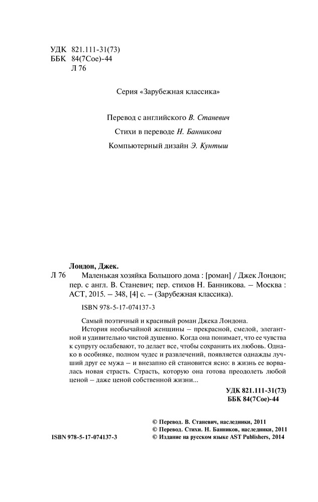 Маленькая хозяйка Большого домаВ данный момент этот товар отсутствует в продаже. Возможно, у нас найдется аналогичный или похожий товар здесь. Серия: Зарубежная классика Самый поэтичный и красивый роман Джека Лондона. |