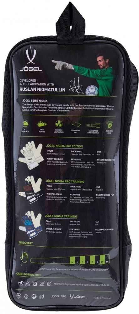 Новая генерация вратарских перчаток из линейки «Nigma» от бренда «Jögel», разработанных совместно с экс-вратарем сборной России Русланом Нигматуллиным. Флагманские профессиональные всепогодные вратарские перчатки cделаны на основе популярного кроя — Roll Negative, который одновременно обеспечивает максимальный обхват мяча и плотную посадку. Ладонь из оригинального немецкого латекса Ultimate Aqua толщиной 4 мм. Данный материал обладает превосходными характеристиками цепкости и износостойкости в любых условиях, но особенно в сырую погоду. Внутренняя подкладка из специальной пены толщиной 4 мм добавляет мягкости. Внешняя сторона перчатки выполнена из Superior латекса в 3.5 мм с 3D-тиснением для уверенной игры кулаками. А благодаря внутренней отделки перчатки из материала Polar Fleece обеспечиваются комфортные ощущения внутри. Специальная технология конструкции перчаток Free Motion практически не сковывает движения пальцев, что позволяет получить максимально эффективный захват. Манжета полностью из латекса на липучке отлично фиксирует кисть, а окно персонализации позволяет выделять ваши перчатки собственным именем или инициалами.