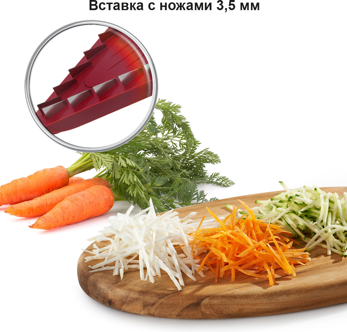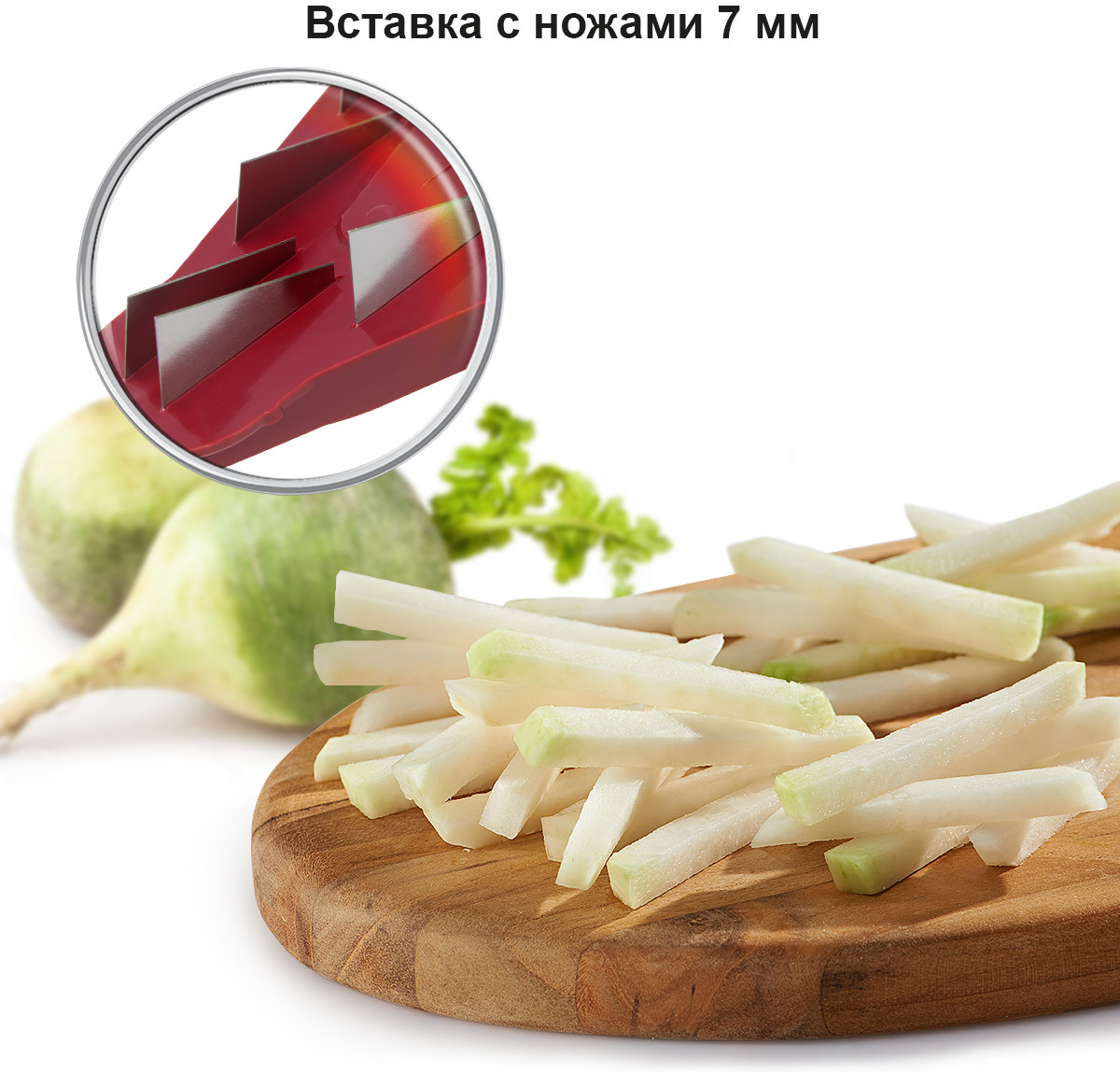 Лучше, чем я ожидала, очень острые ножи, нарезка окрошки прошла раза в 2 быстрее, чем с обычной теркой. Ничего не разлетается. Изначально неправильно держатель использовала, когда повернула, оказалось, что вообще очень удобно все, быстро. Думаю, закажу еще насадку к ней.