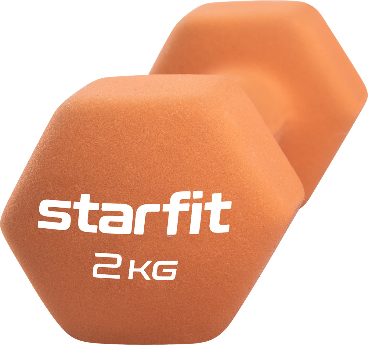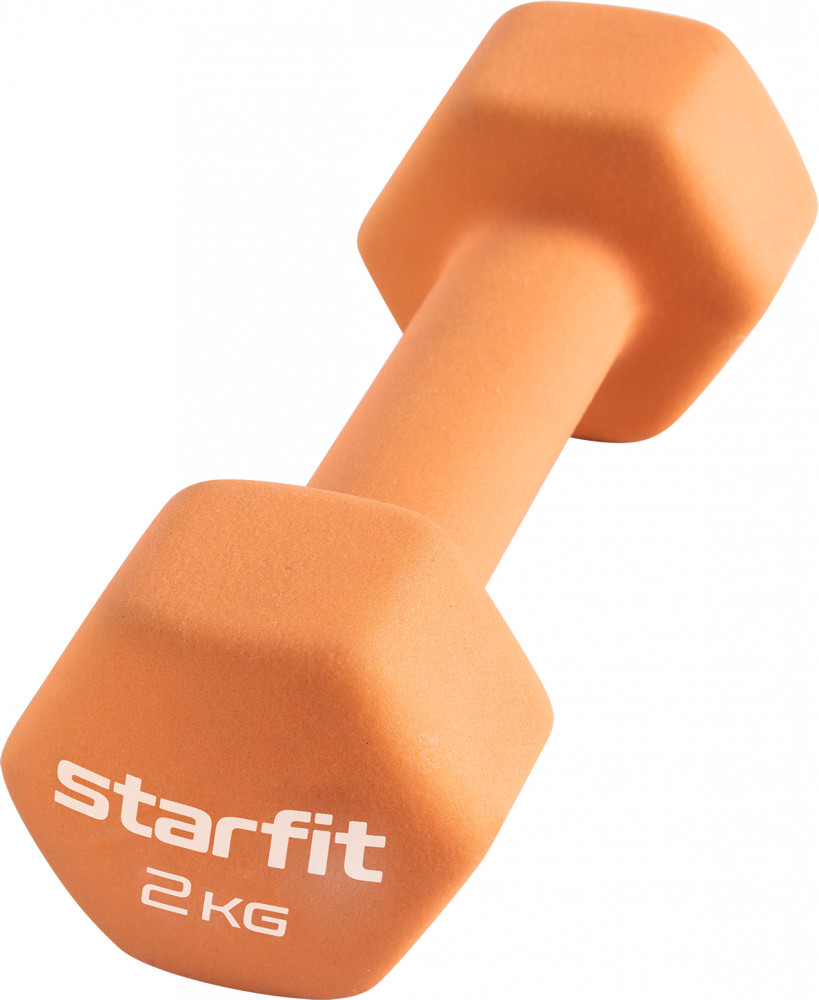 Гантель с неопреновым покрытием обладает хорошим сцеплением с ладонью. Особенность покрытия — поглощение материалом части влаги с ладоней. Гексагональная форма устраняет проблему перекатывания гантели по полу.