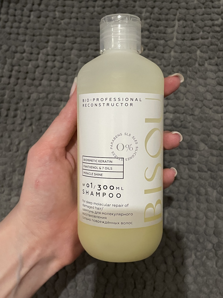 Bisou Шампунь кератиновый «Reconstructor»-25% +105 хорошо пенится приятный запах жидкая текстура придаёт блеск
