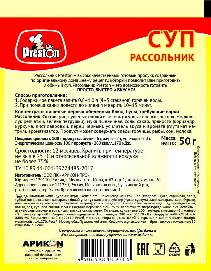 Preston Суп «Рассольник»вкусный кислый не похож на рассольник В данный момент этот товар отсутствует в продаже. Возможно, у нас найдется аналогичный или похожий товар здесь. Высококачественный готовый продукт, созданный по оригинальному домашнему рецепту, позволит Вам приготовить любимый суп. Простой и удобный в приготовлении суп станет отличным экспресс-обедом, чтобы набраться сил и вернуться к работе. Удобно, сытно и вкусно! |
