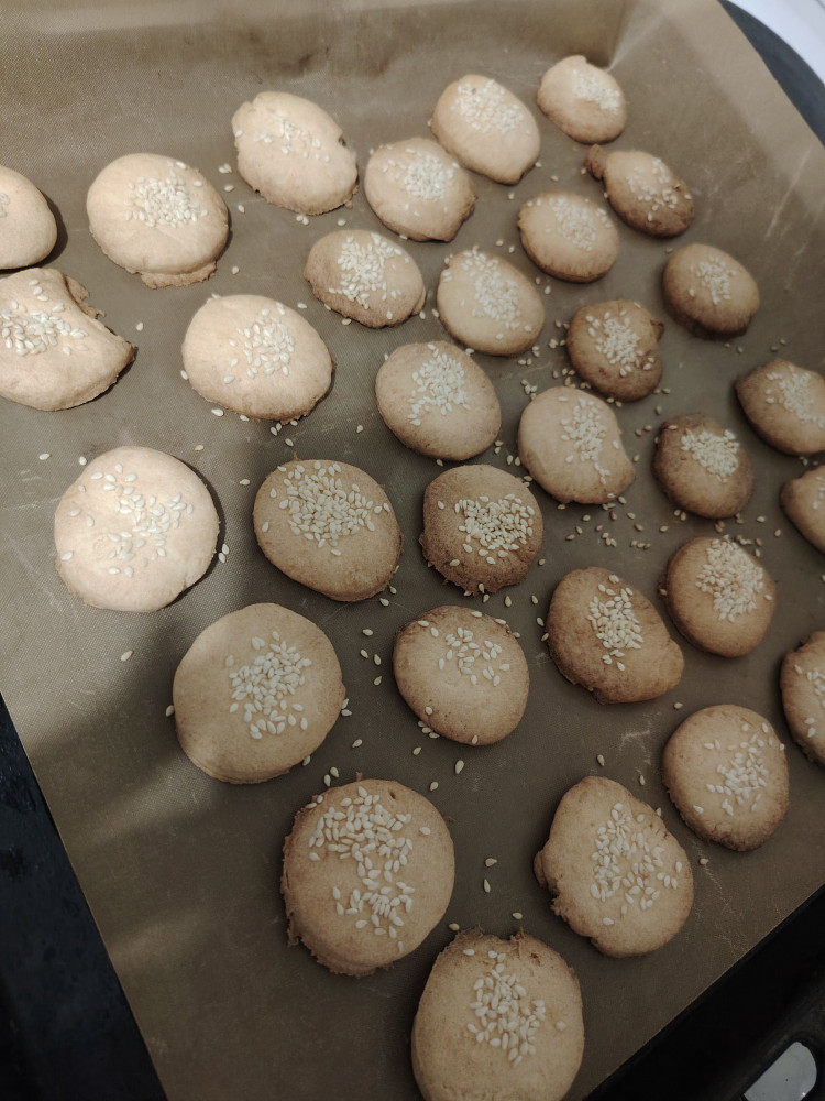 Очень удобно, добавил желток, чуть белка, масло, смешал, поддержал в холодильнике, раскатал, выпек. Печенье сахарное и там действительно очень много сахара. Добавила сверху чуть кунжута. Для тех кто на аутоимунном протоколе рекомендую, но очень сладкое конечно