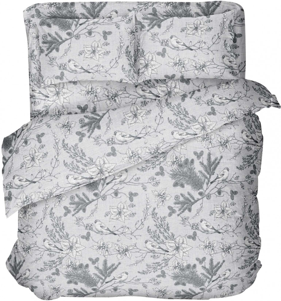 Реальная расцветка интереснее, чем на фото - фон серо-голубой, а рисунок растений и птиц выполнен как графитом на белом. Простыня и пододеяльник после первой стирки на 30 градусов дали усадку на 5-6 см, наволочка - на 3 см. Бязь неплотная, просвечивает.
