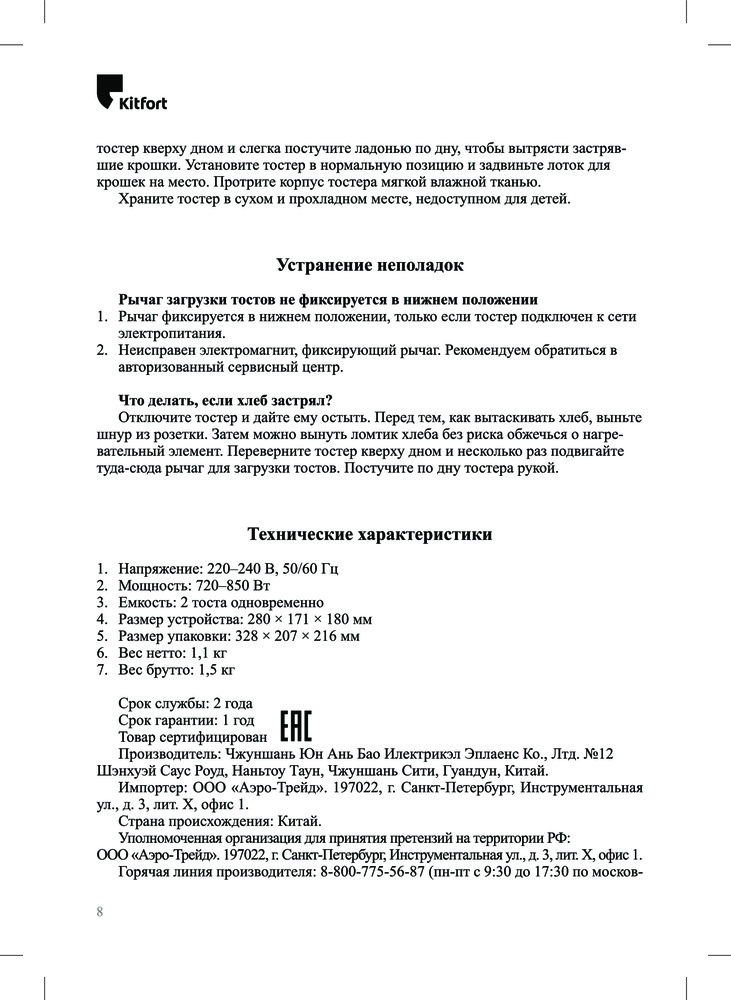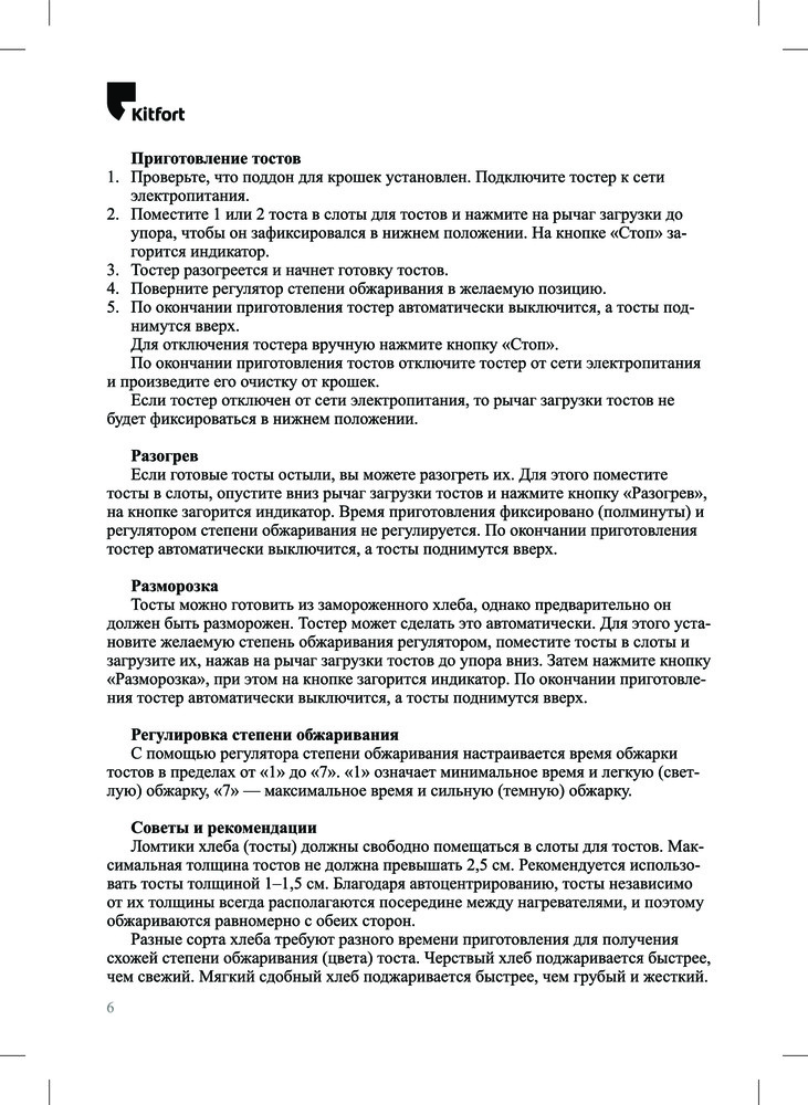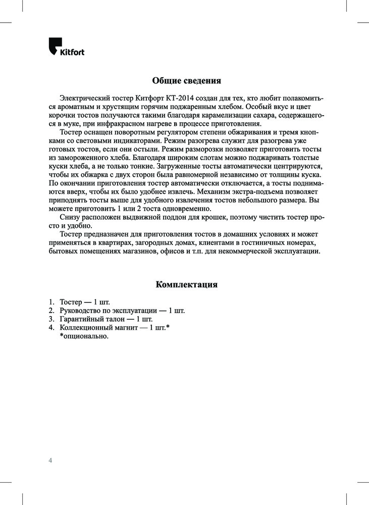 Описанию соответствует. Тостер классный, компактный, легкий, цвет бежевый - очень приятный глазу. Приходит в фирменной коробке с инструкцией по применению. Имеет много плюшек: боковые стенки из металла, поддон для крошек, автоцентрирование тостов, разморозка, подогрев, семь уровней прожарки. Что понравилось - по окончании прожарки тосты не выпрыгивают из тостера, боковые стенки сильно не нагреваются, поддон для крошек легко вытаскивается. Также в подарок идет фирменный магнит🐳. Тосты получаются ароматные подрумяненные, хрустящие - это зависит от вида хлеба и степени прожарки, в основном опытным путем. В целом заказом доволен. Спасибо производителю Kitfort и Flip.kz. Рекомендую!!!