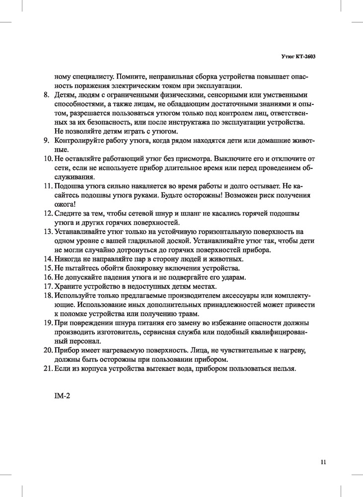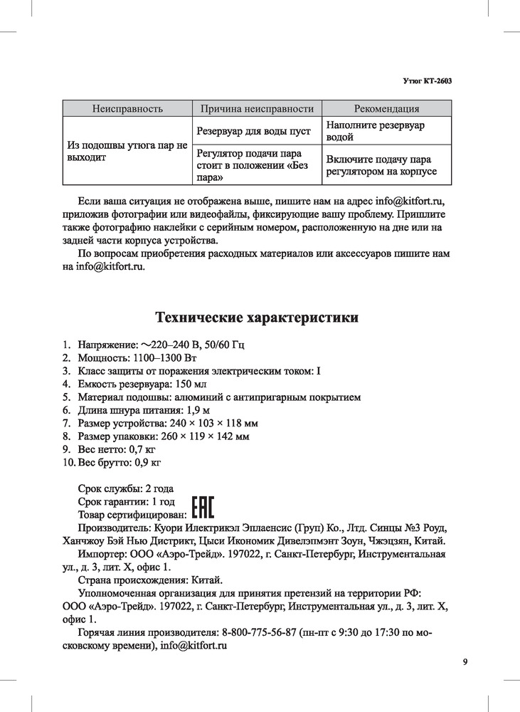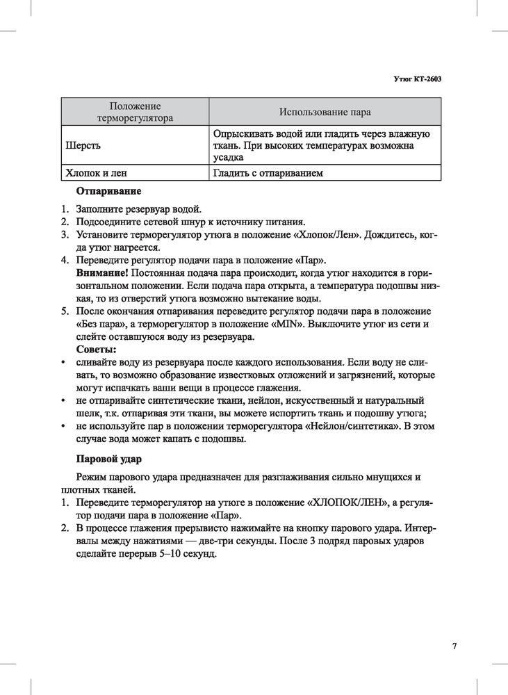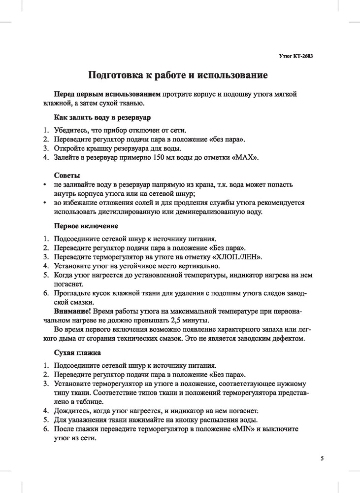 У КТ-2603 предусмотрена регулировка температуры и подачи пара. Залив воду в резервуар, можно одновременно проводить глажку и отпаривание вещей. Также утюг оснащён функциями вертикального отпаривания, парового удара и распыления воды.