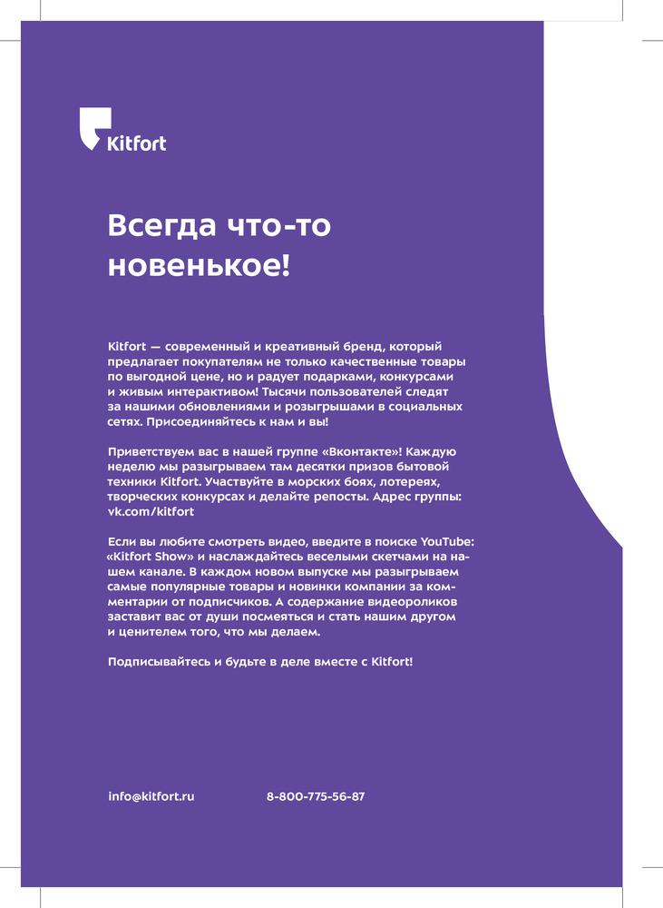Российский бренд Kitfort занимает лидирующие позиции на рынке бытовой техники для кухни и дома. Основанная в 2011 году в городе Санкт-Петербурге, компания Kitfort стремится предоставить своим клиентам передовые технологии и инновационные решения для повседневных задач и создания комфортного пространства в доме.