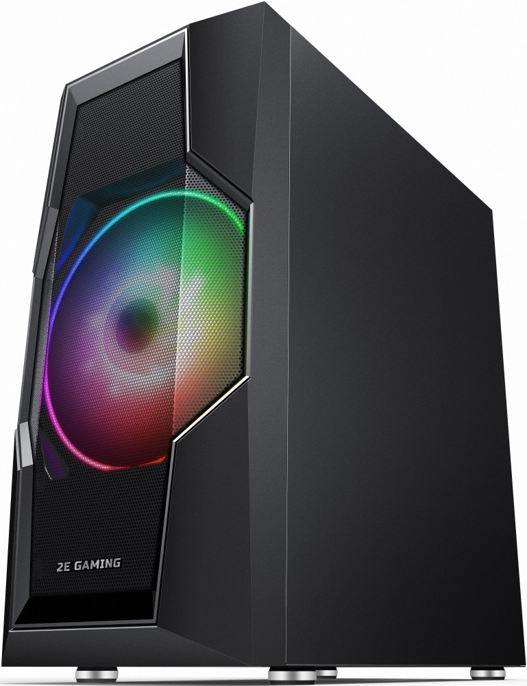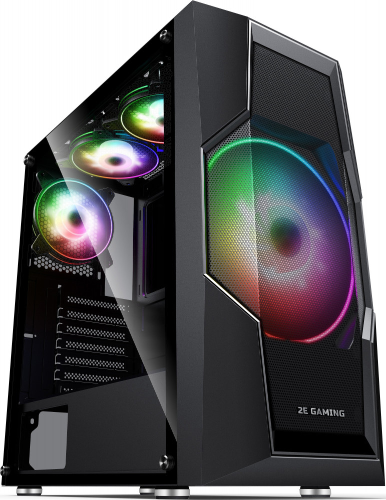Корпус 2E Gaming TURBO (G2057B) черный с 200 мм ARGB вентилятором за сетчатой лицевой панелью и дополнительно двумя 120 мм ARGB вентиляторами на верхней и одним 120 мм ARGB вентилятором на задней панелях.