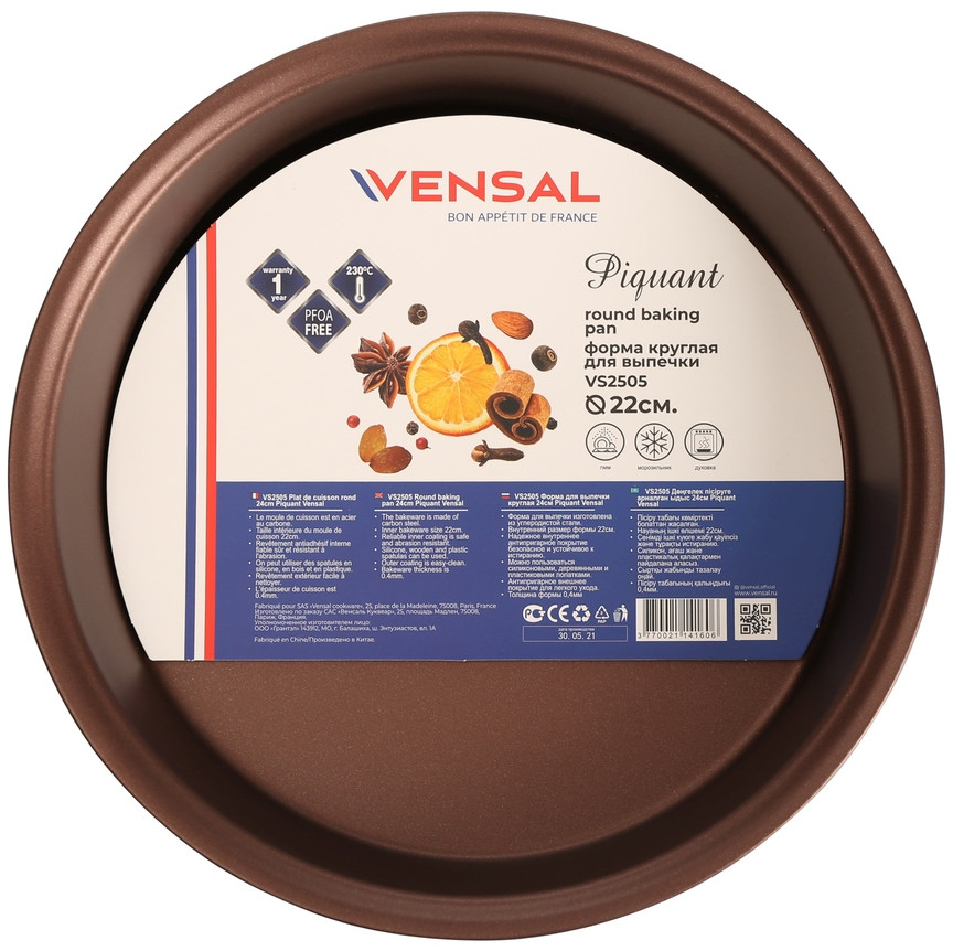 Vensal Форма для выпечки круглаяВ данный момент этот товар отсутствует в продаже. Возможно, у нас найдется аналогичный или похожий товар здесь. Серия: Piquant Форма круглая для выпечки изготовлена из углеродистой стали и обладает превосходными антипригарными свойствами. Не содержит в составе PFOA, кадмий, свинец. Форма найдет свое применение для выпечки большинства кулинарных шедевров. Благодаря антипригарному покрытию готовый продукт легко вынимается, а чистка формы не составит большого труда. |