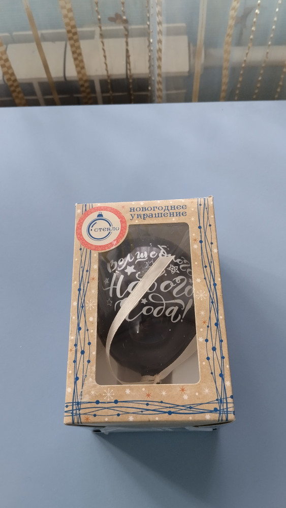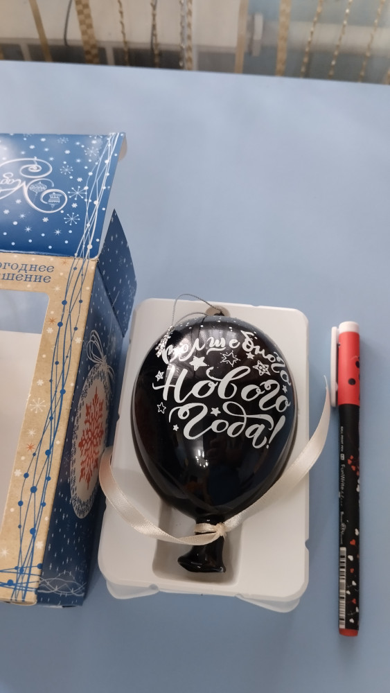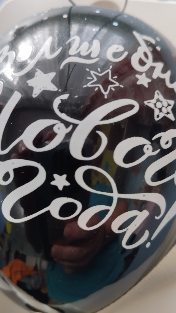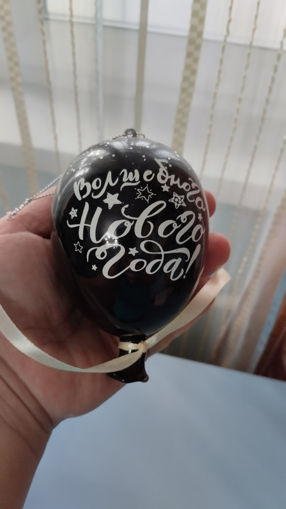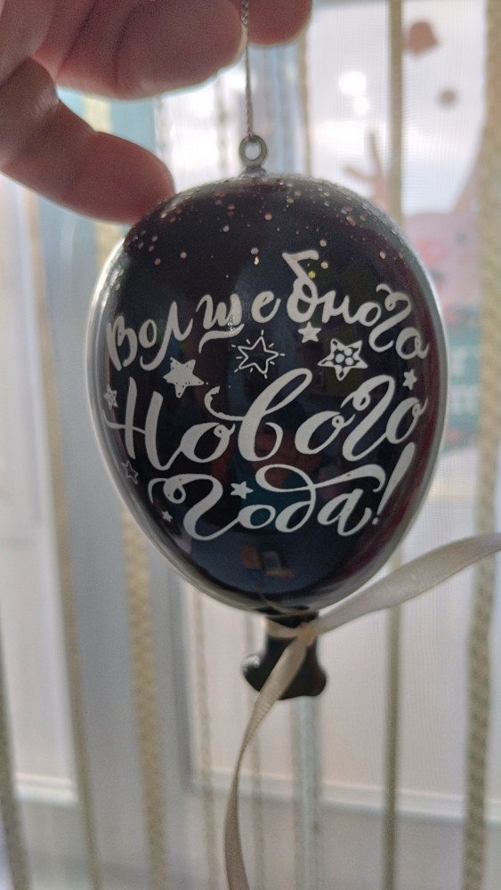 Красивый, большой шар. Буквы и звёзды немного потёрты, прочти незаметно. Пленка от индивидуальной коробки трётся об игрушку, когда та в коробке, потому нужно аккуратно доставать. Всё целое. Не очень нравится, что ушко, за которое крепится верёвочка, пластиковое и просто клеем приклеено к стеклянной игрушке сверху. Хотелось бы и другие шары из набора приобрести.