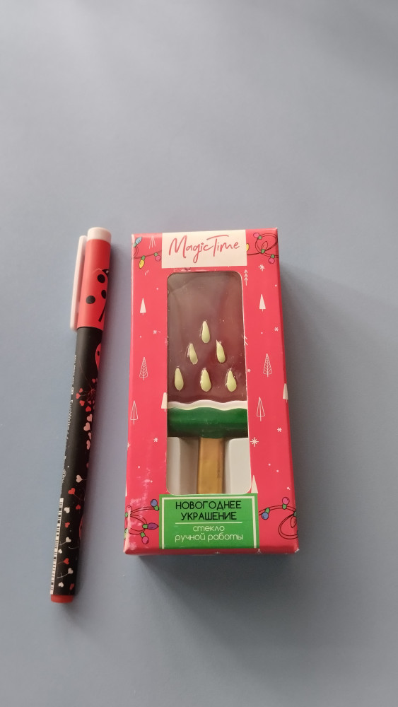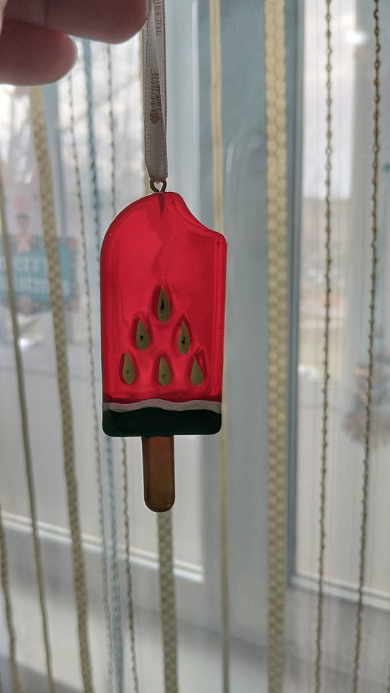 Ну так себе. На любителя. Мне не понравилось, взяла только для завершения коллекции из-за скидки. Всё видно на фото. На свет игрушка прозрачная. Сверху аккуратно ввинчена прямо в стекло петля для верёвочки. С одной стороны игрушка поцарапана на семенах. Белая и зелёная краска выглядят на игрушке отвратительно - у нас дверь в подъезде такой зелёной краской покрашена. Довольно тяжёлая. Доставлено все в целости, спасибо Флип.