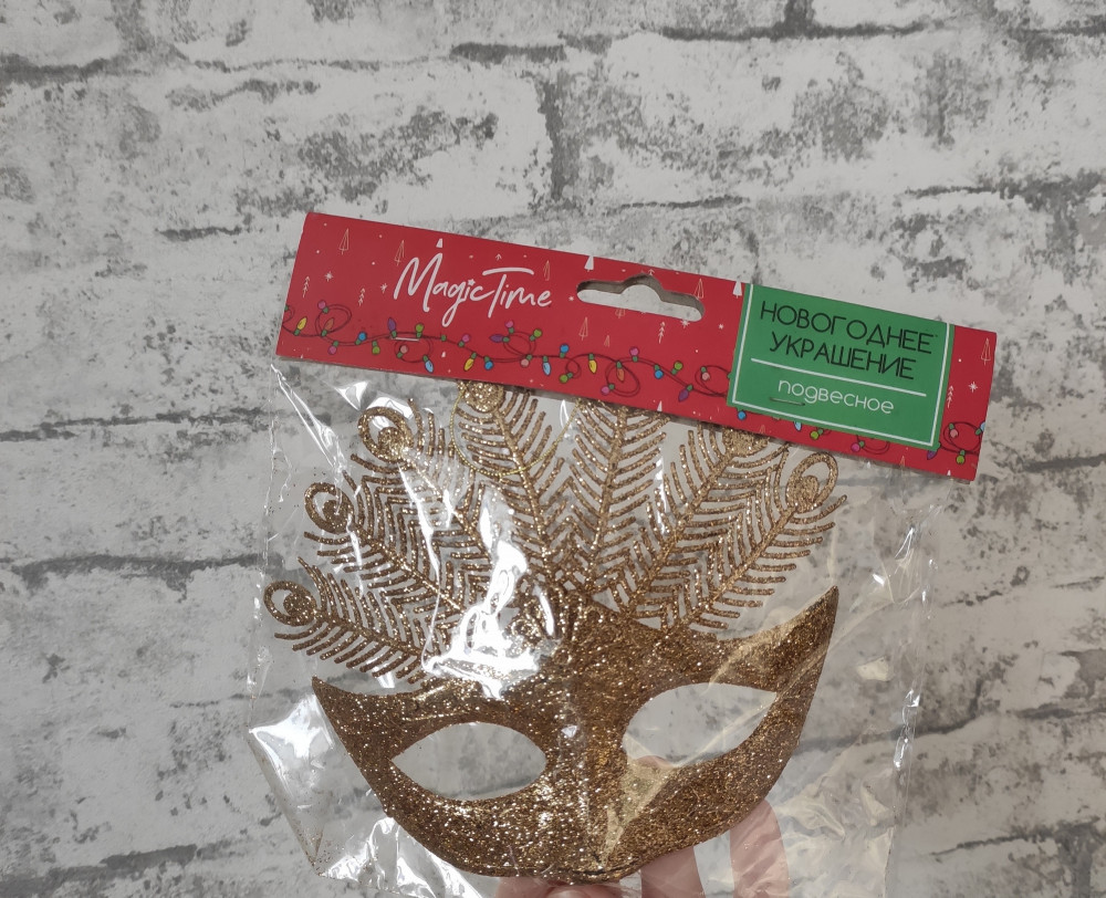 Маска интересная. Блёстки немного осыпаются. Размер игрушки подходит для большой ёлки.