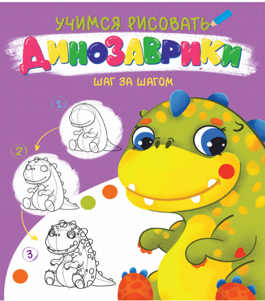 "Учимся рисовать. Шаг за шагом. Динозаврики" большого размера, в ламинированном переплёте их тонкого картона. Страницы белые. Образцы динозавриков цветные, забавные. Работать по этой книжке надо "с разворотом страниц": Слева - показана поэтапная схема рисования динозаврика, в центре - его цветной образец, и цветные кружочки с показом необходимых для рисования цветов. Справа - чистая белая страница для вашего рисования. Отличная книжка, но, конечно, для детей младшего возраста не подойдёт. Думаю, что примерно тс 10 лет. Но книжка отличная, если маленький ребёнок - купите "на вырост". Потому что позже такой книжки может уже не быть!