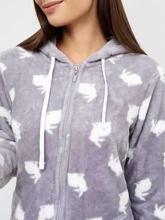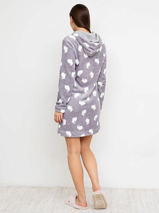 Халат из мягкой, очень приятной ткани, прямого силуэта. На капюшоне трикотажный подклад в цвет. Замок удобный, есть кармашки. Если не хотите модель впритык, смело берите на размер больше, он слегка укороченный.