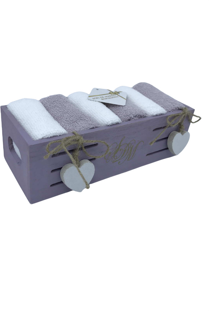 хороший набор для подарка но, от фиолетового там нет ничего, бледно сиреневая корзиночка и бежевые салфетки