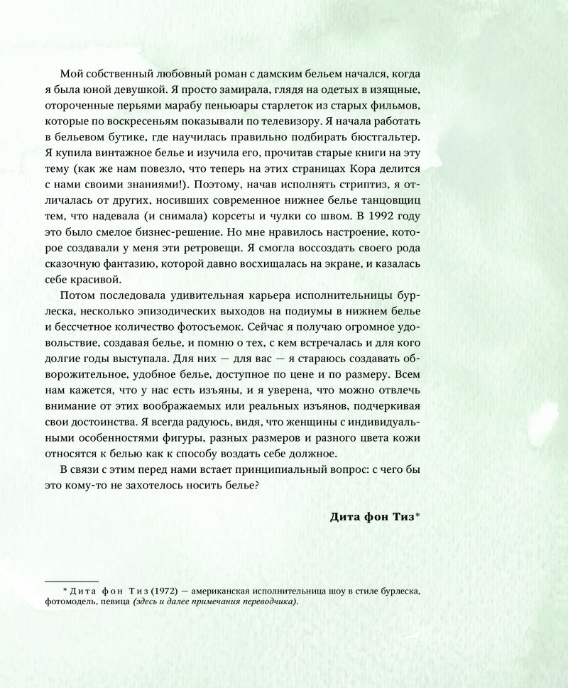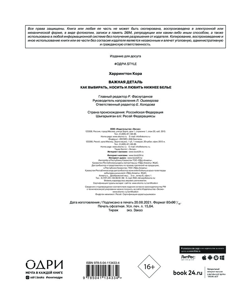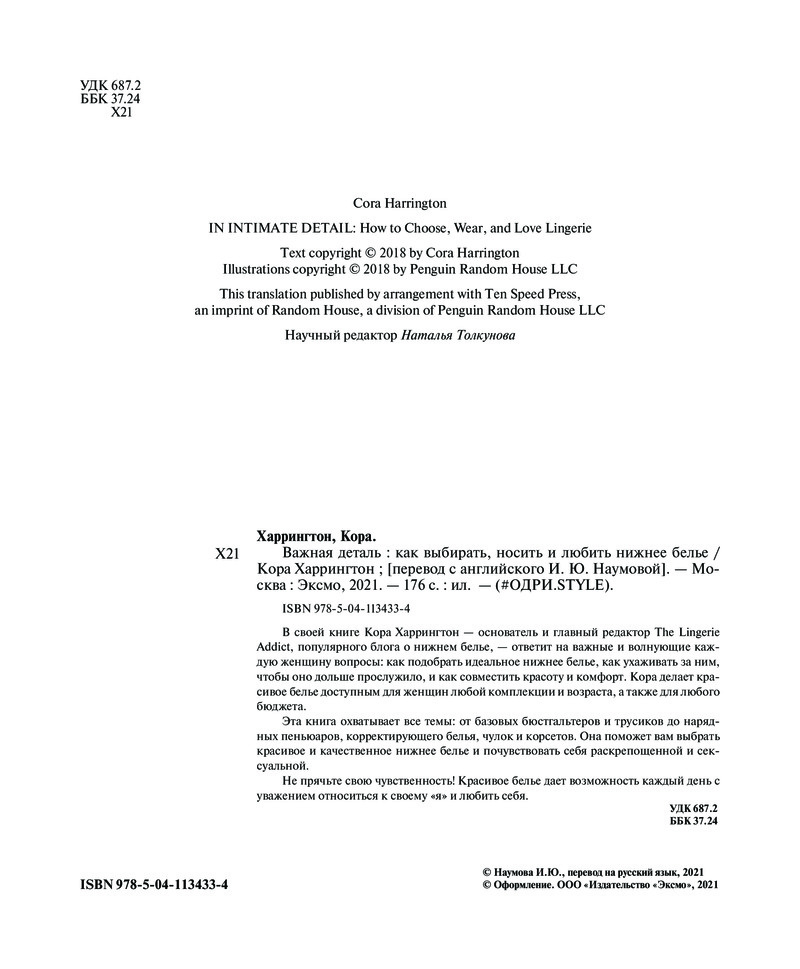 Важная деталь. Как выбирать, носить и любить нижнее бельеВ данный момент этот товар отсутствует в продаже. Возможно, у нас найдется аналогичный или похожий товар здесь. Серия: #Одри.Style В своей книге Кора Харрингтон — основатель и главный редактор The Lingerie Addict, популярного блога о нижнем белье, — ответит на важные и волнующие каждую женщину вопросы: как подобрать идеальное нижнее белье, как ухаживать за ним, чтобы оно дольше прослужило, и как совместить красоту и комфорт. Кора делает красивое белье доступным для женщин любой комплекции и возраста, а также для любого бюджета. |